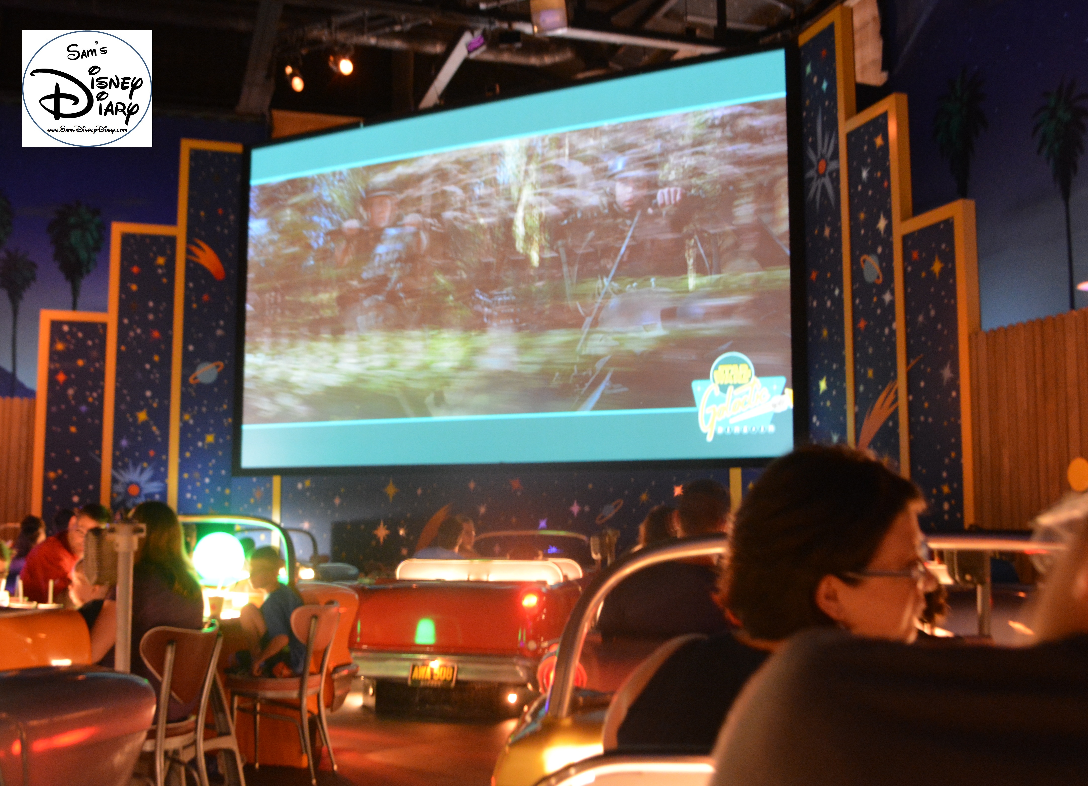 Your “drive-in” car seat faces a large screen filled with Star Wars film clips, original Disney segments, and even content from the infamous Star Wars Holiday Special, including Boba Fett’s animated debut.