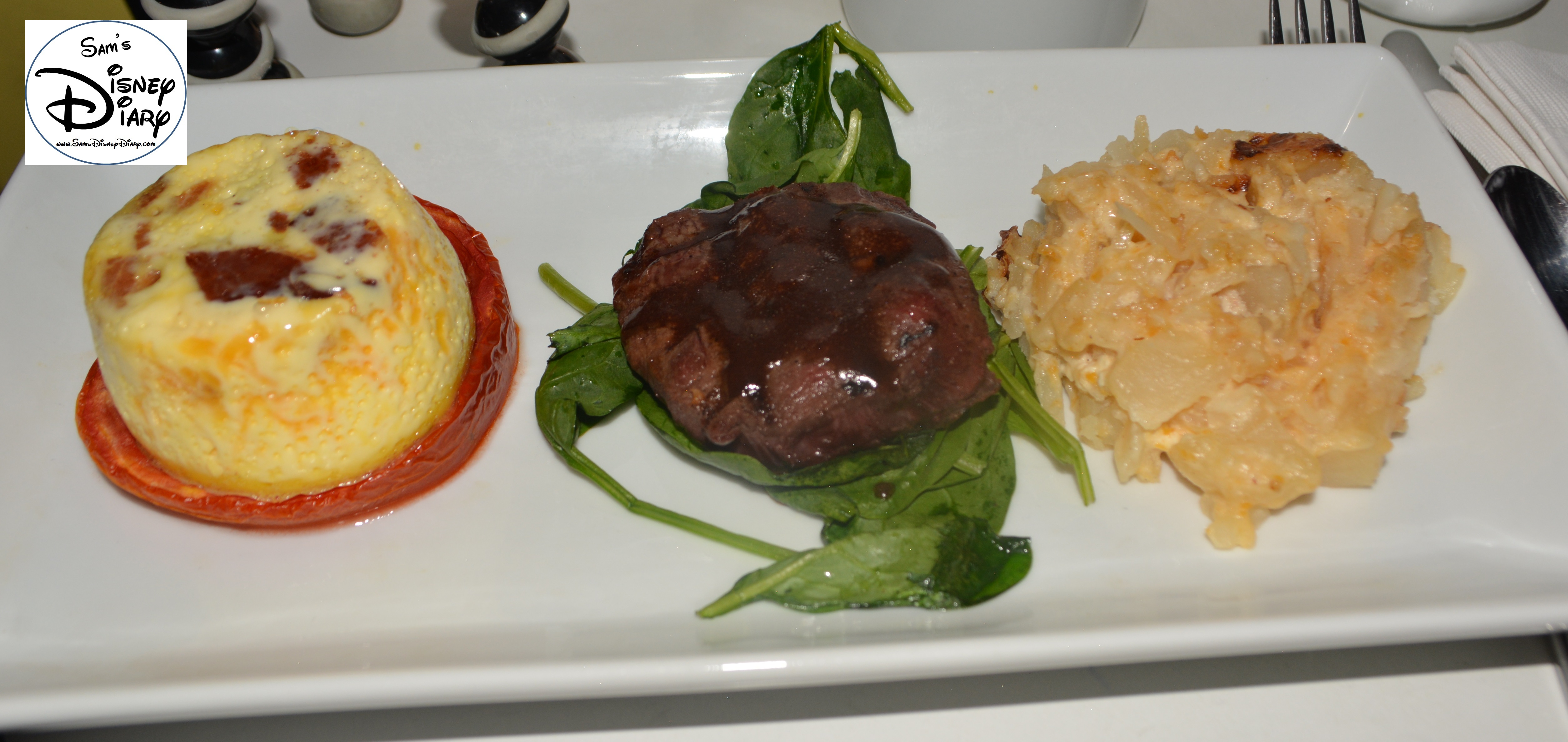 Star Wars Weekend Galactic Breakfast. The Kessel Run. Grilled Beef Tenderloin on Baby Spinach with Bacon and Cheddar Custard on Roasted Tomato and Cheesy Horseradish Potatoes