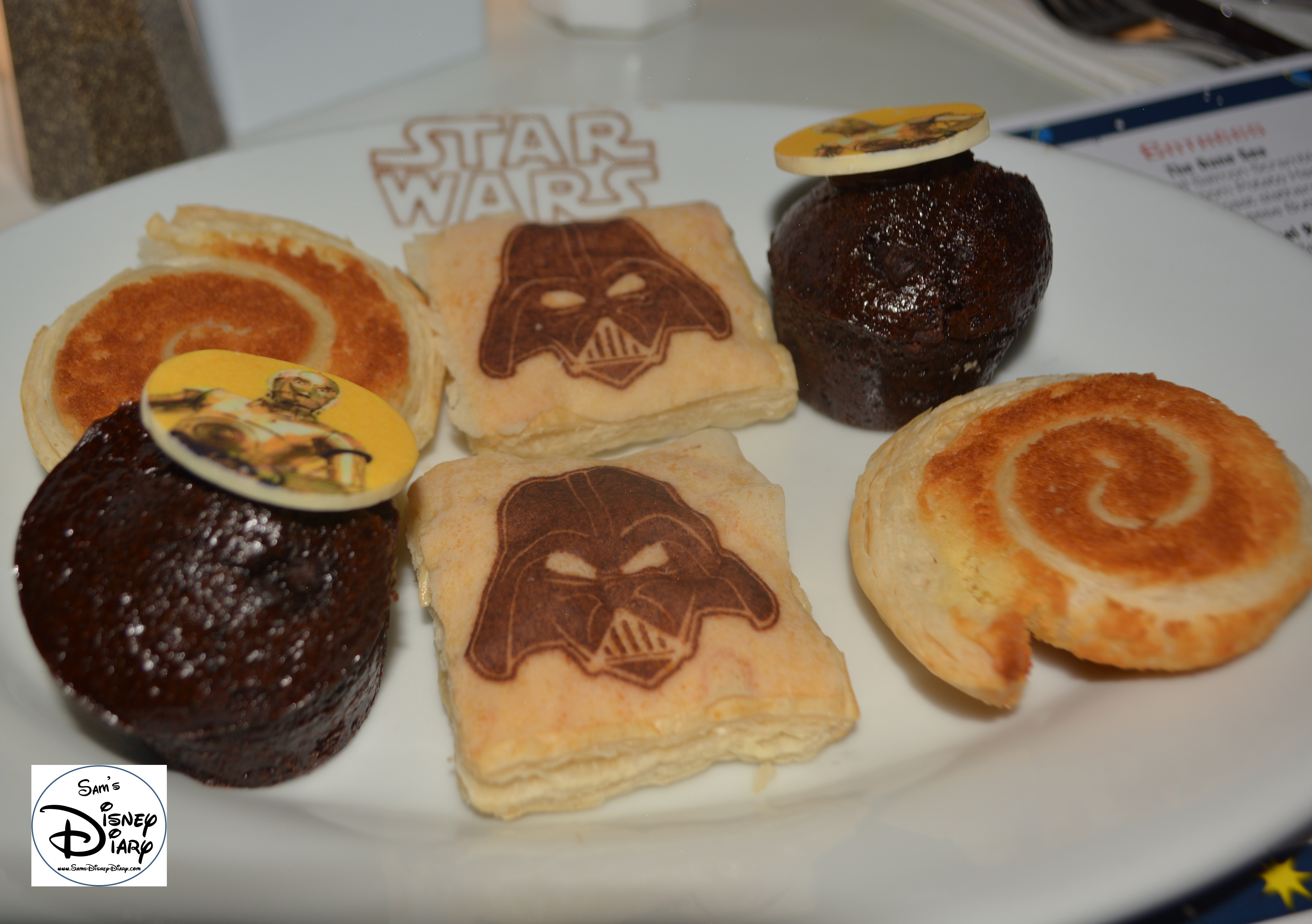 Star Wars Weekend Galactic Breakfast. Breakfast Pastries including Vanilla Cream Turnover, Almond Pastry, and Double Chocolate Muffin