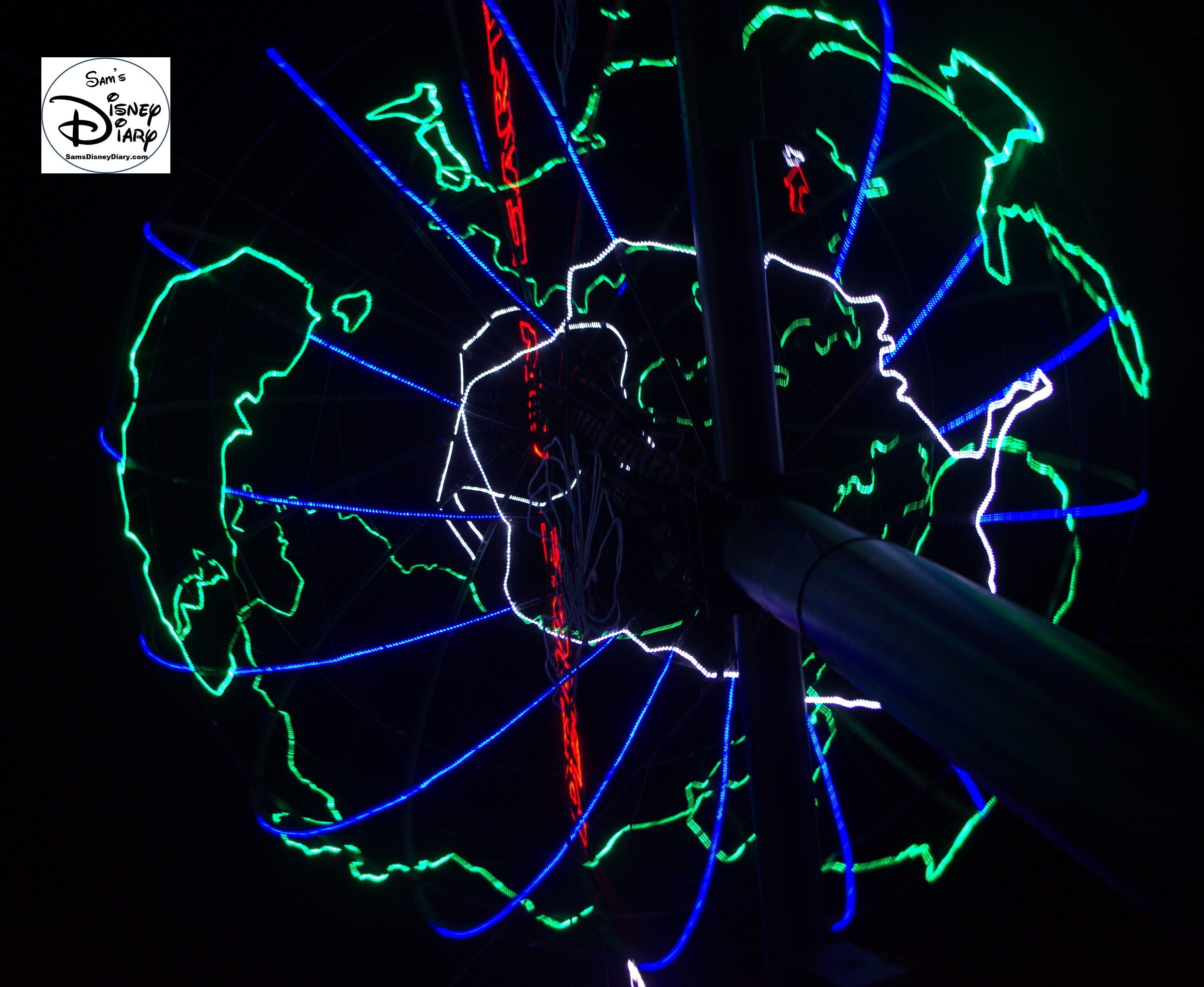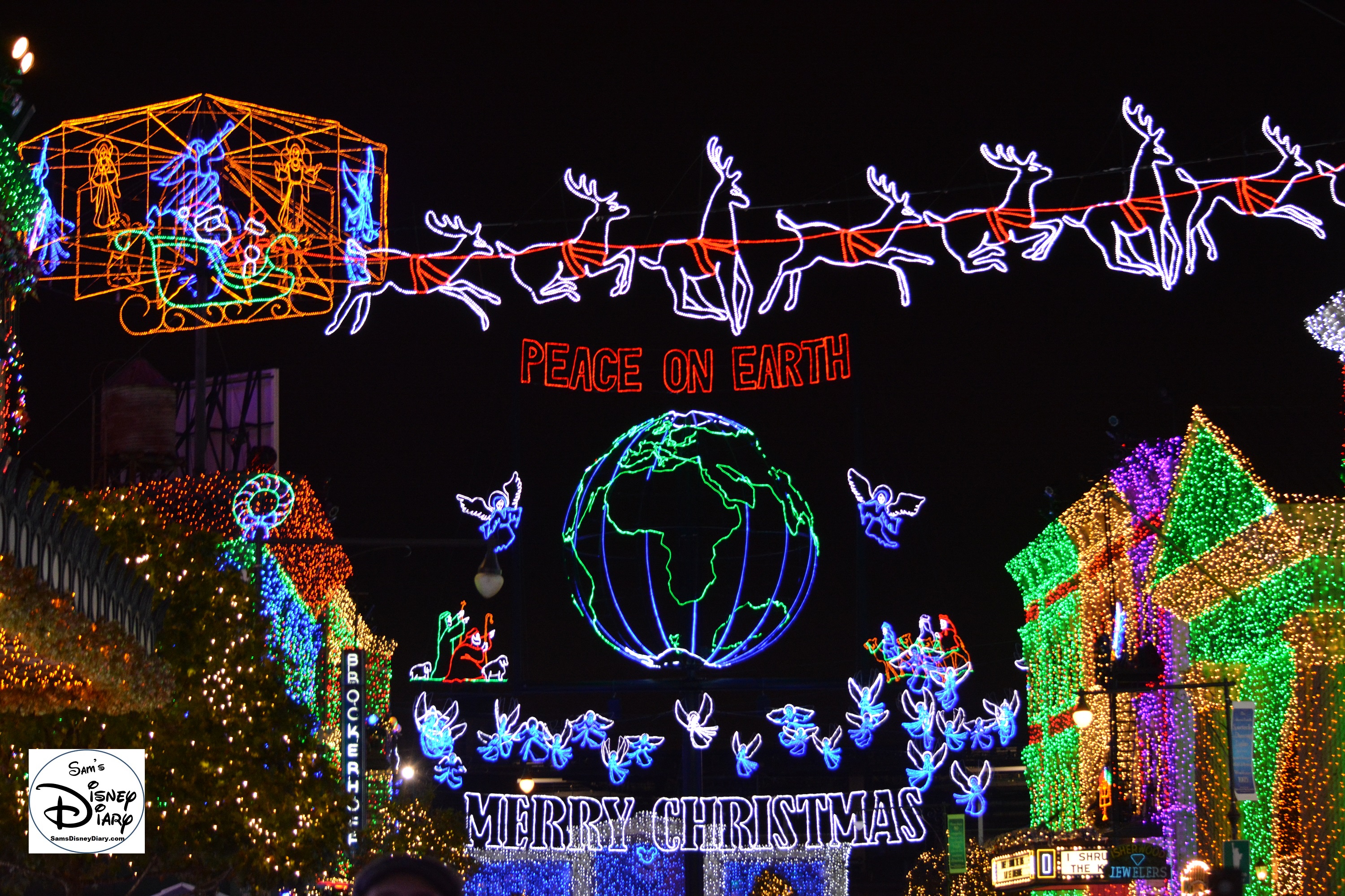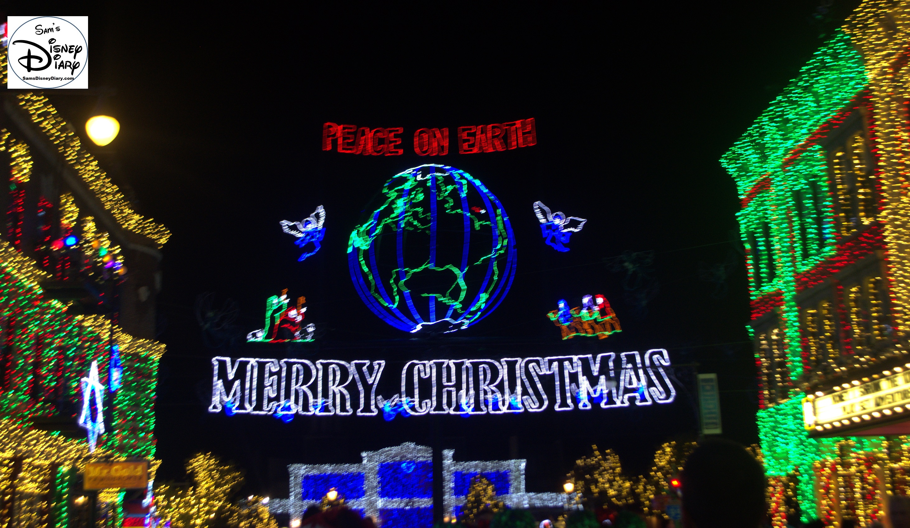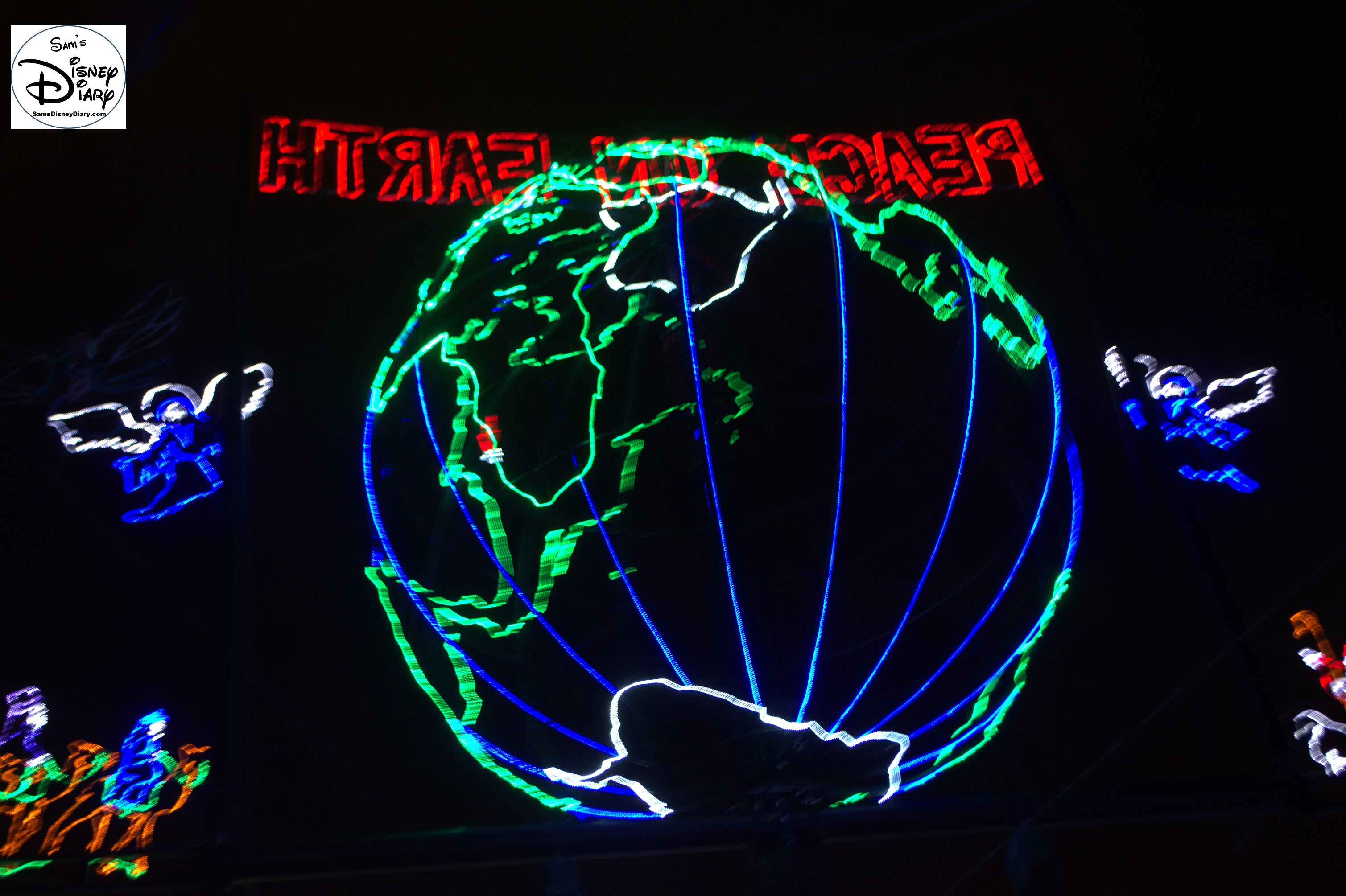 The Osborne Family Lights Feature Marquee – Peace on Earth (The red light on the globe is the original location of the lights, Little Rock, AZ)