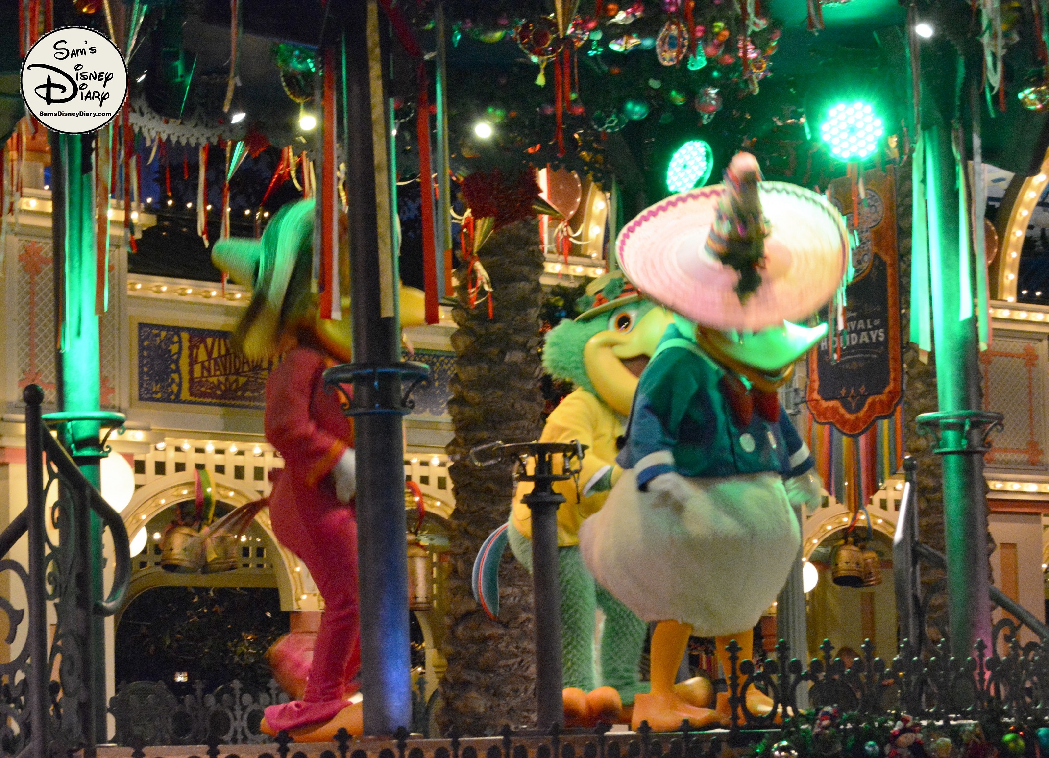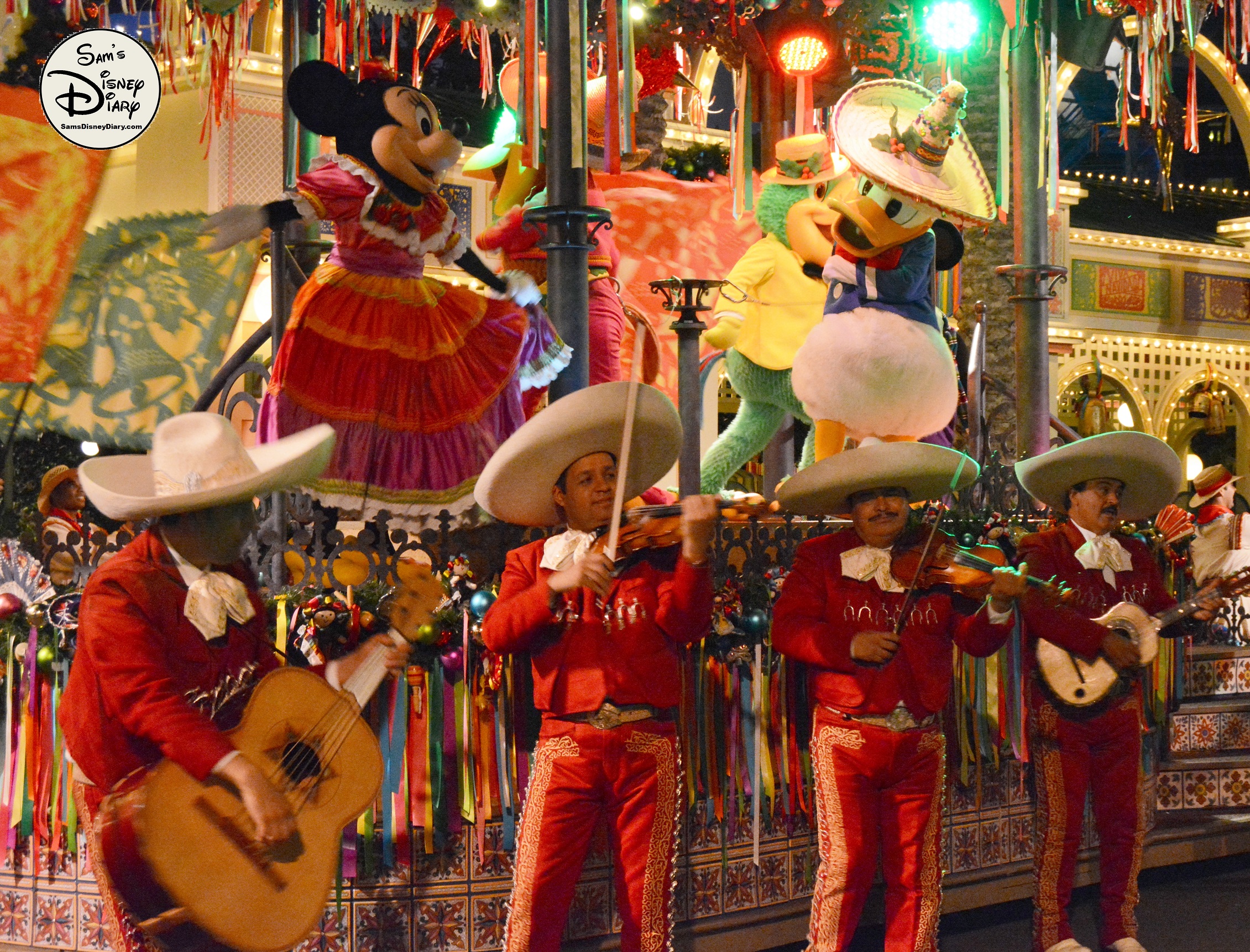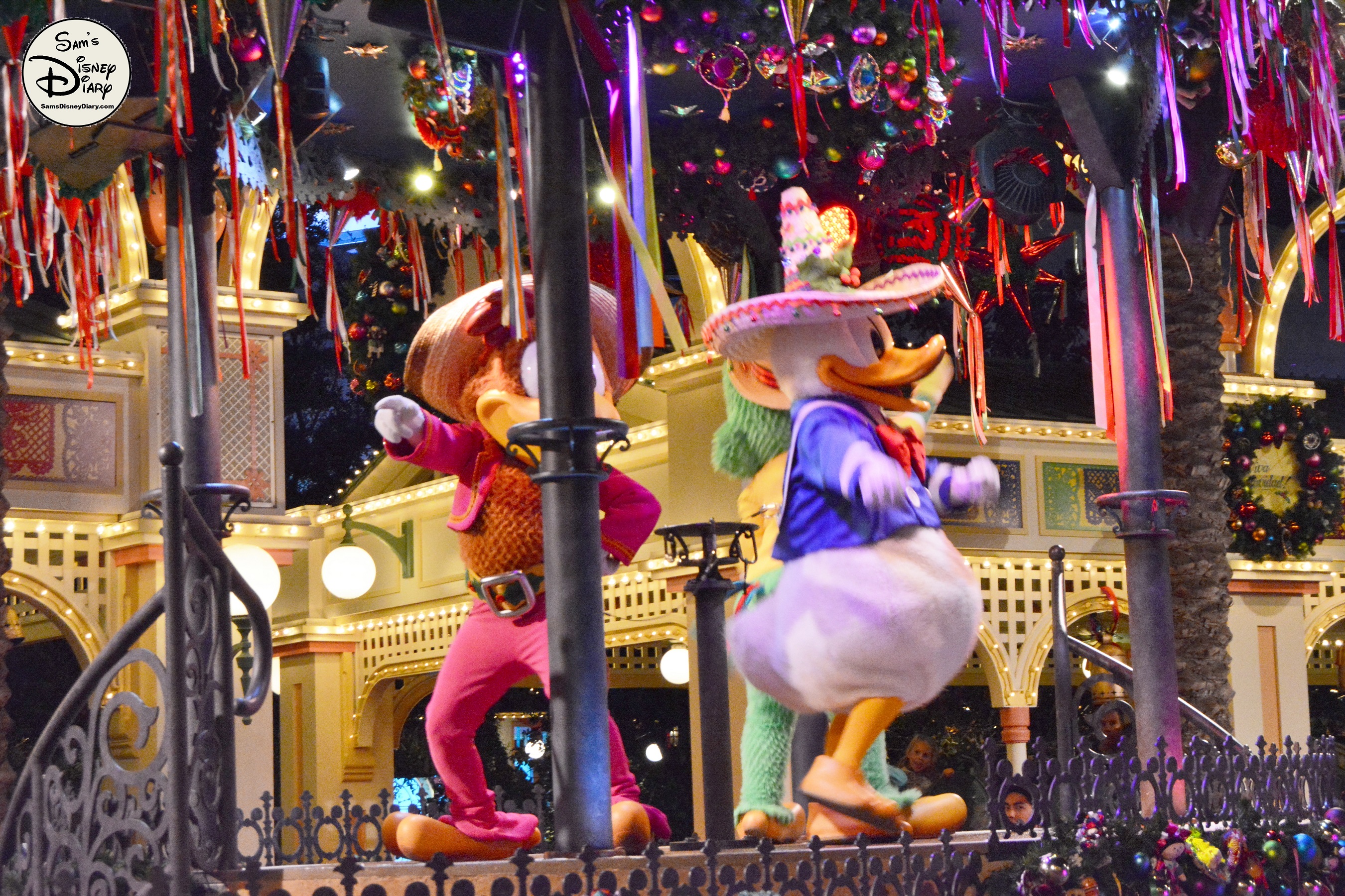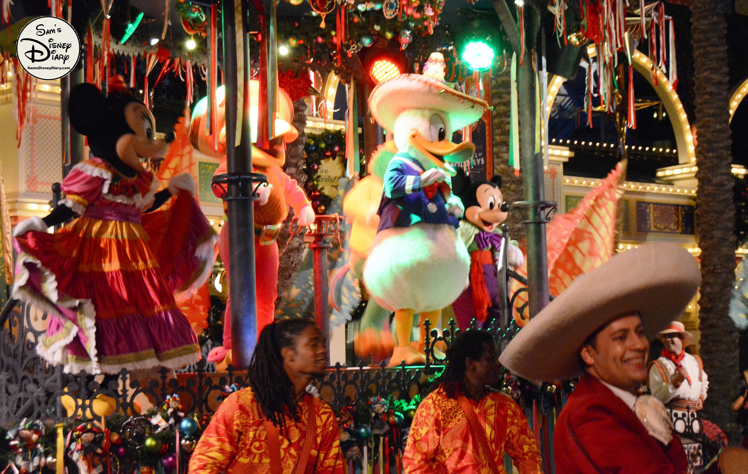 The show is led by The Three Caballeros—Donald Duck, Panchito, and José Carioca—joined by Mickey and Minnie Mouse in their holiday best. As the celebration unfolds, samba dancers, mariachi musicians, and giant 12-foot masquerade puppets fill the streets with joy. Guests of all ages are swept up in the rhythms of Mexican and Brazilian holiday traditions.