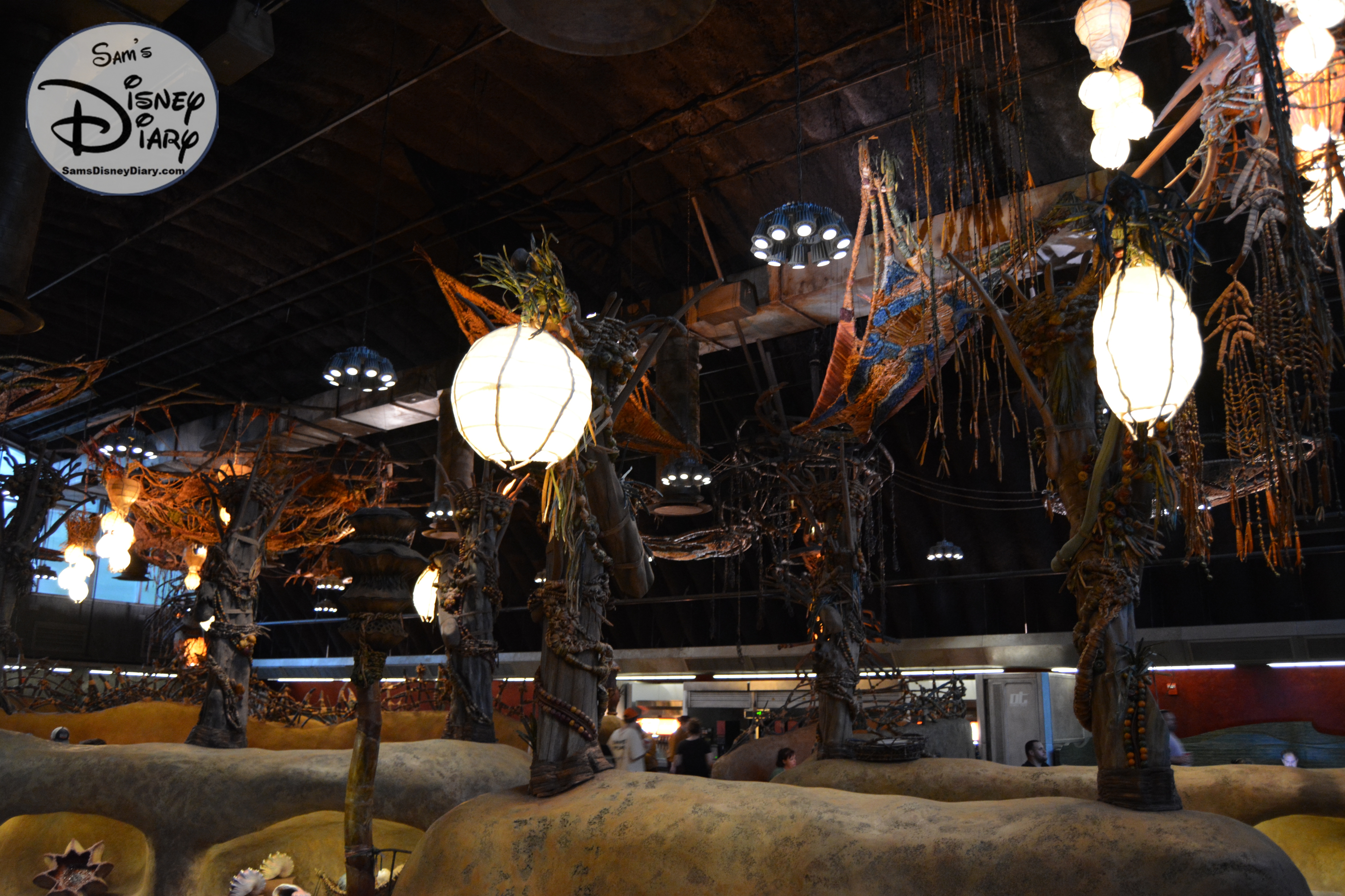 Colors of Mo’ara offers face painting and tribal gear. Hungry? Grab a glowing drink at Pongu Pongu, or enjoy a full meal at Satu’li Canteen, featuring grilled meats, tofu, and Na’vi-inspired steamed pods.