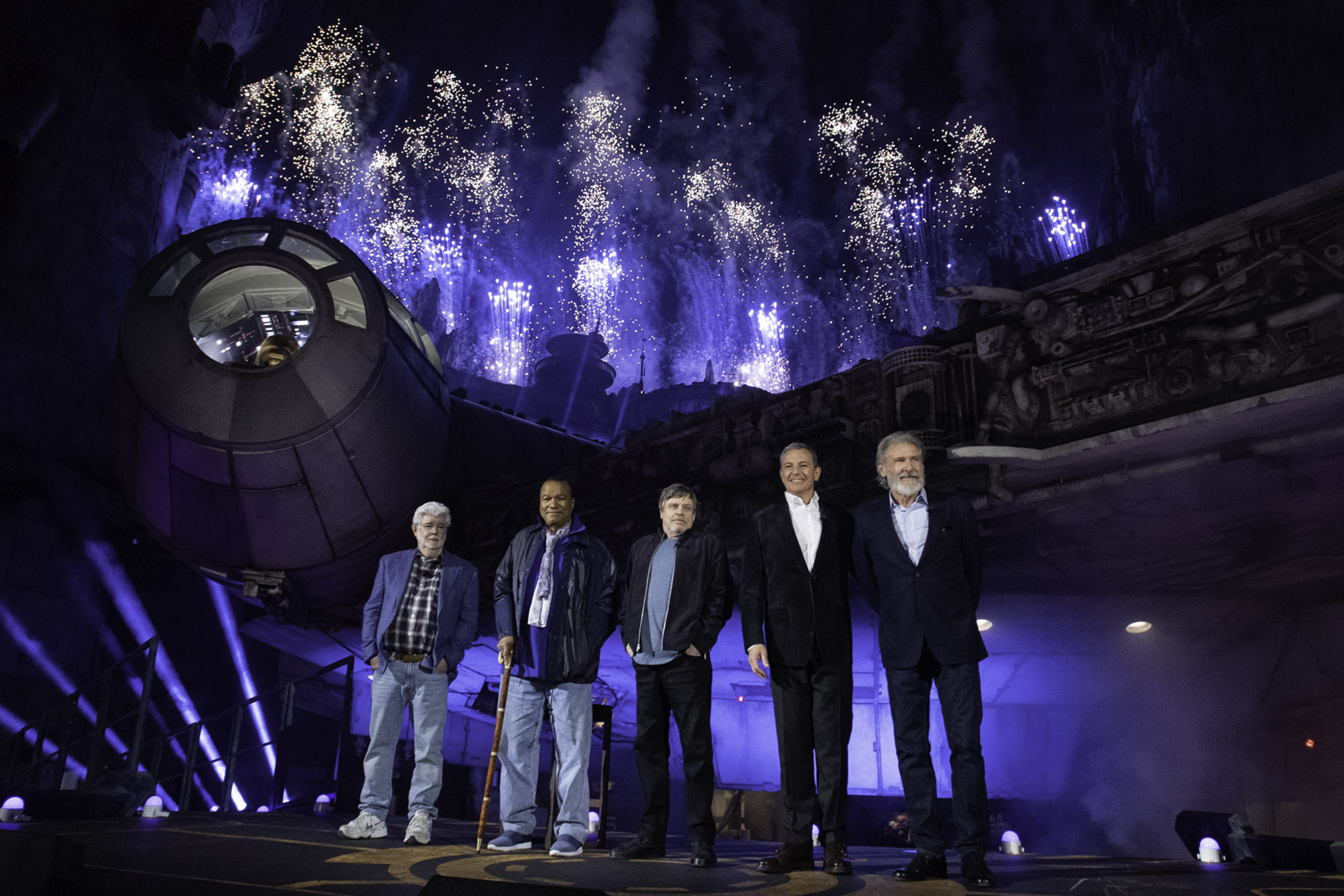 Star Wars: Galaxy’s Edge at Disneyland Park in Anaheim, California, lights up with galactic fanfare, May 29, 2019, as (l-r) Star Wars creator George Lucas, actors Billy Dee Williams, Mark Hamill, Walt Disney Company Chairman and CEO Bob Iger and actor Harrison Ford celebrate the opening Disney’s largest single-themed land expansion ever. Star Wars: Galaxy’s Edge opens May 31, 2019, at Disneyland Resort in California and Aug. 29, 2019, at Walt Disney World Resort in Florida. (Richard Harbaugh/Disneyland Resort)