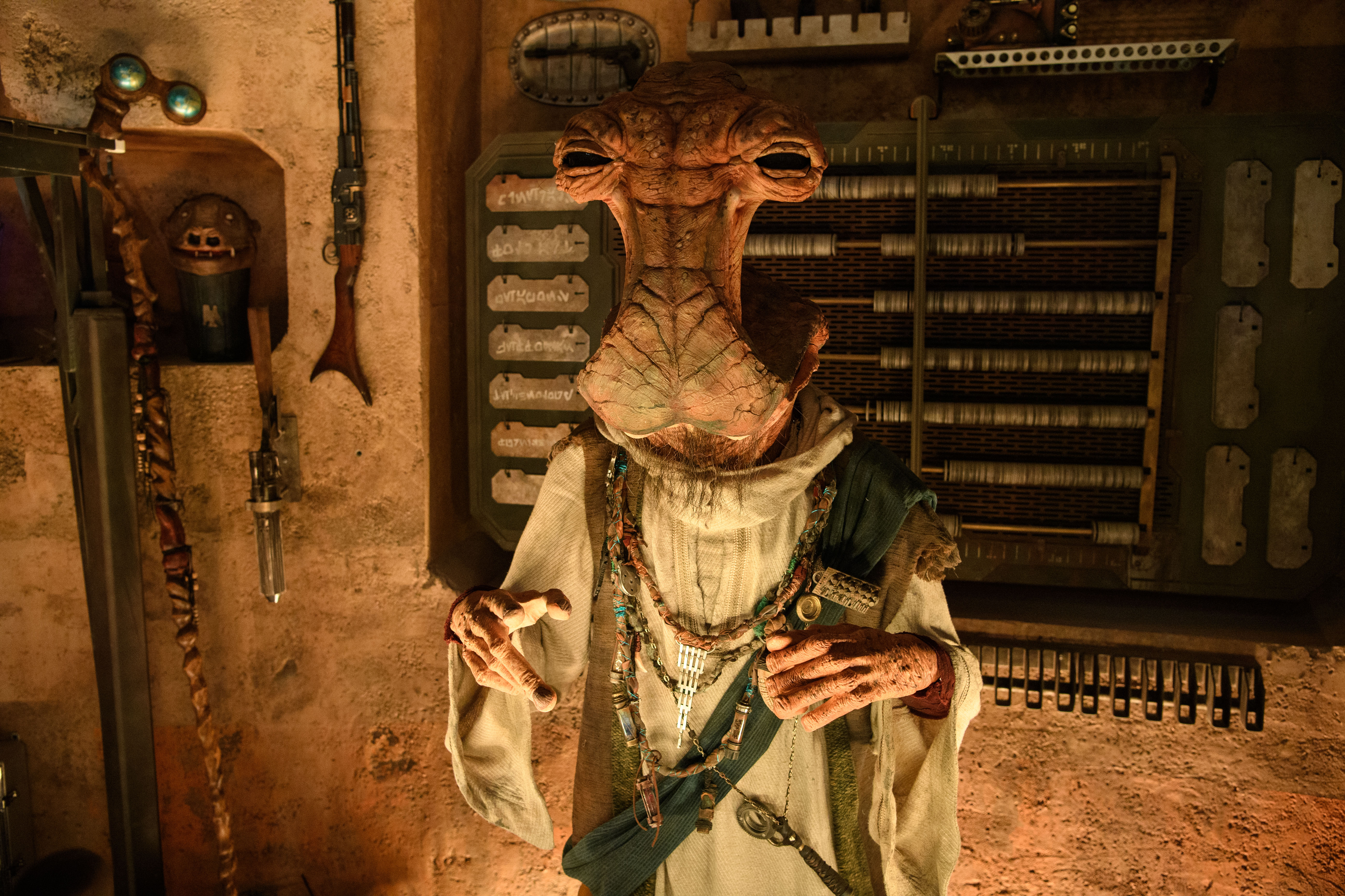The notorious Weequay pirate, Hondo Ohnaka, gives guests their mission prior to boarding Millennium Falcon: Smugglers Run at Star Wars: GalaxyÕs Edge at Disneyland Park in Anaheim, California, and at Disney’s Hollywood Studios in Lake Buena Vista, Florida. (Richard Harbaugh/Disney Parks)