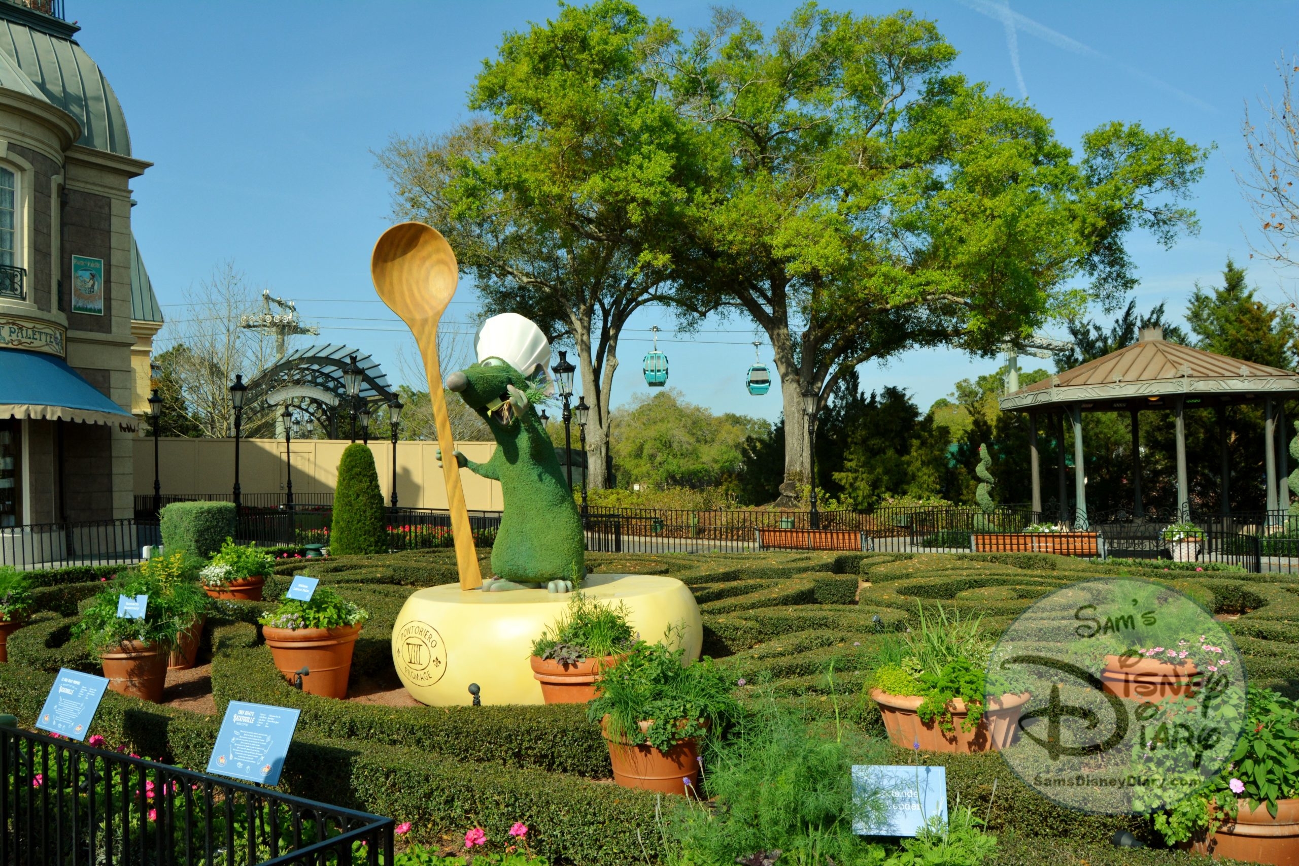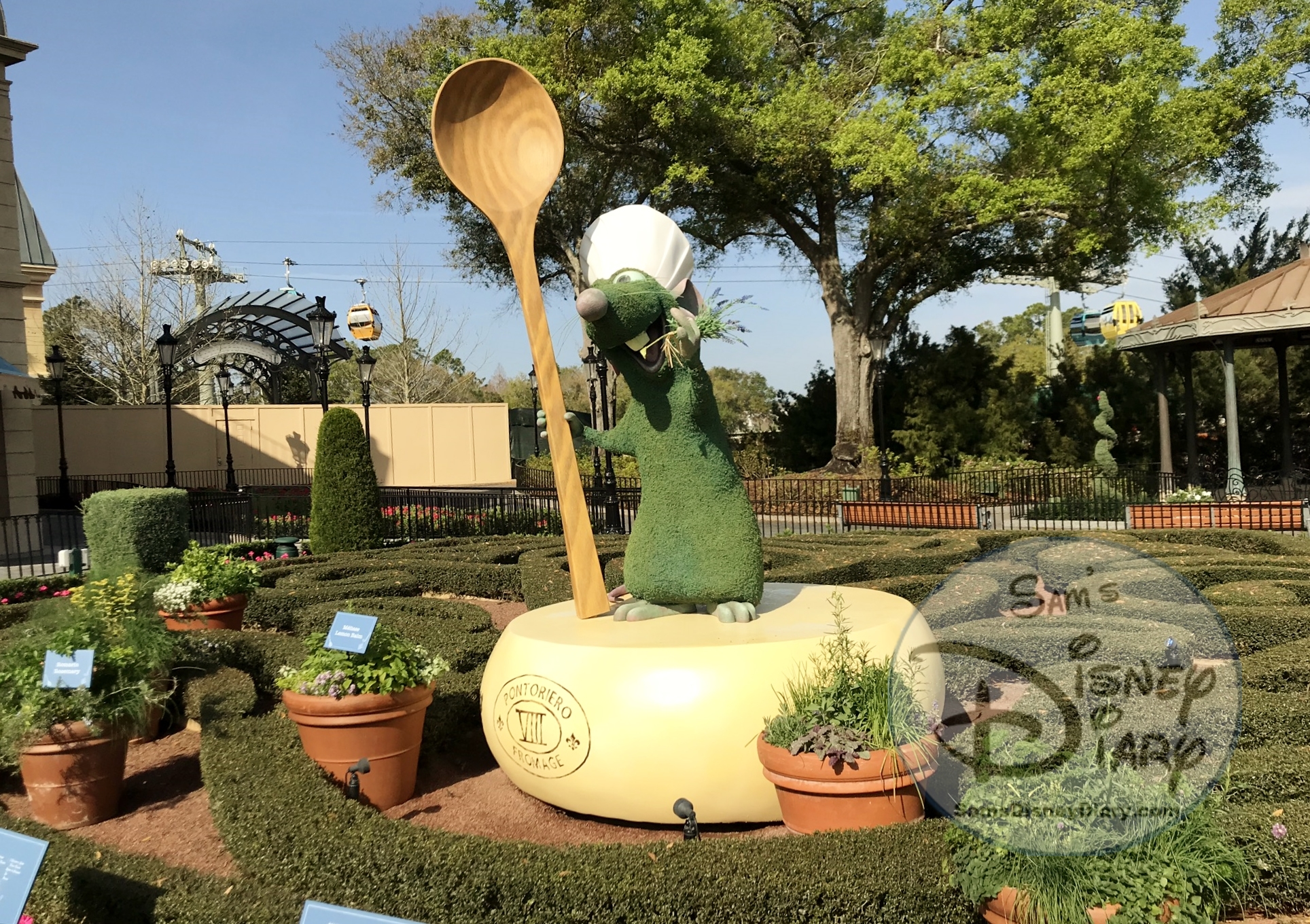 • Remy Topiary at the France Pavilion, celebrating Remy’s Ratatouille Adventure opening in the summer of 2020. The five-foot floral Remy stands atop a wheel of cheese in a veggie-and-herb garden.