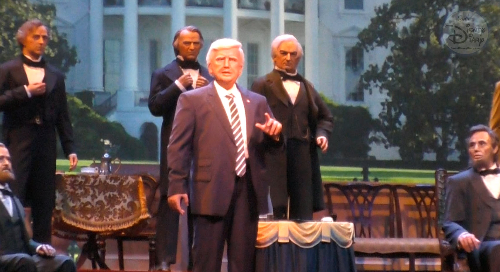 In 2017, Donald Trump was added to the Hall of Presidents. Like Obama, he recited the Oath of Office and gave a brief speech.