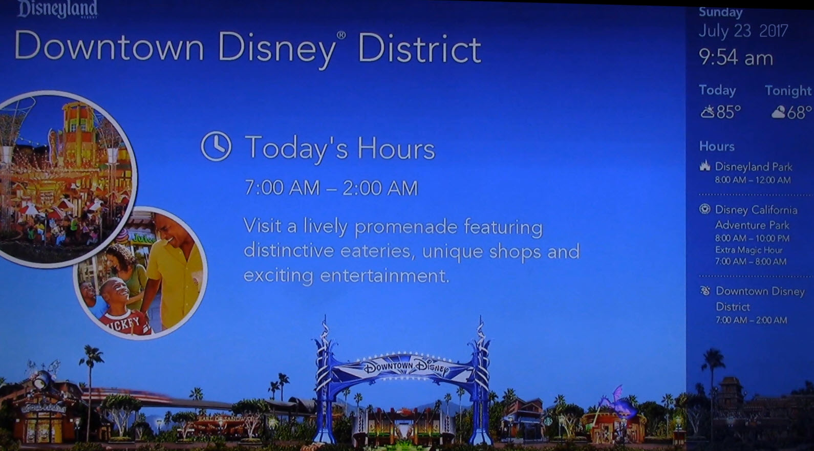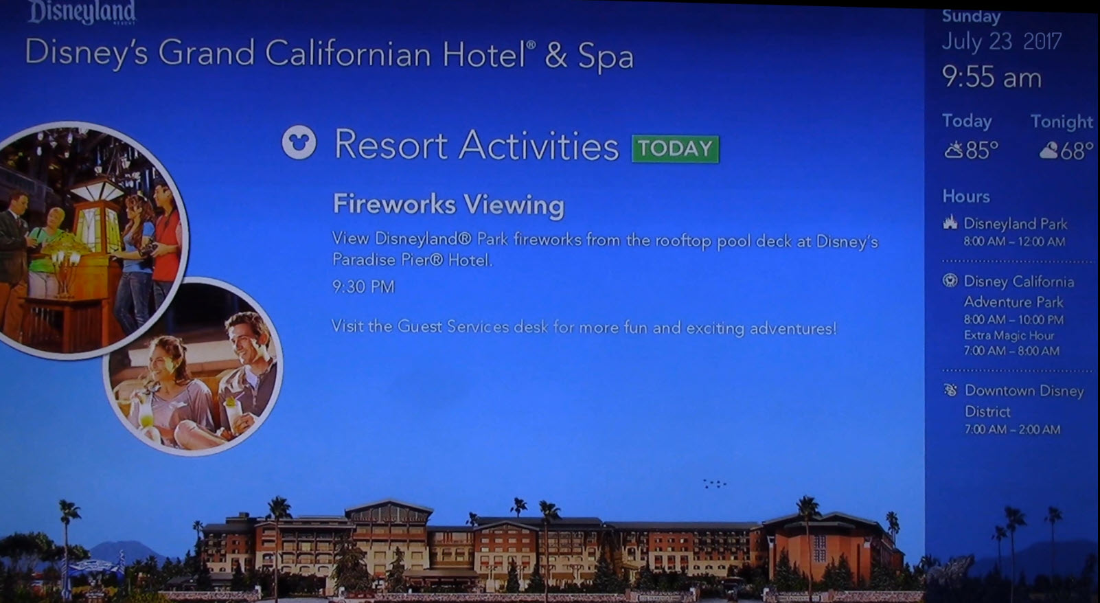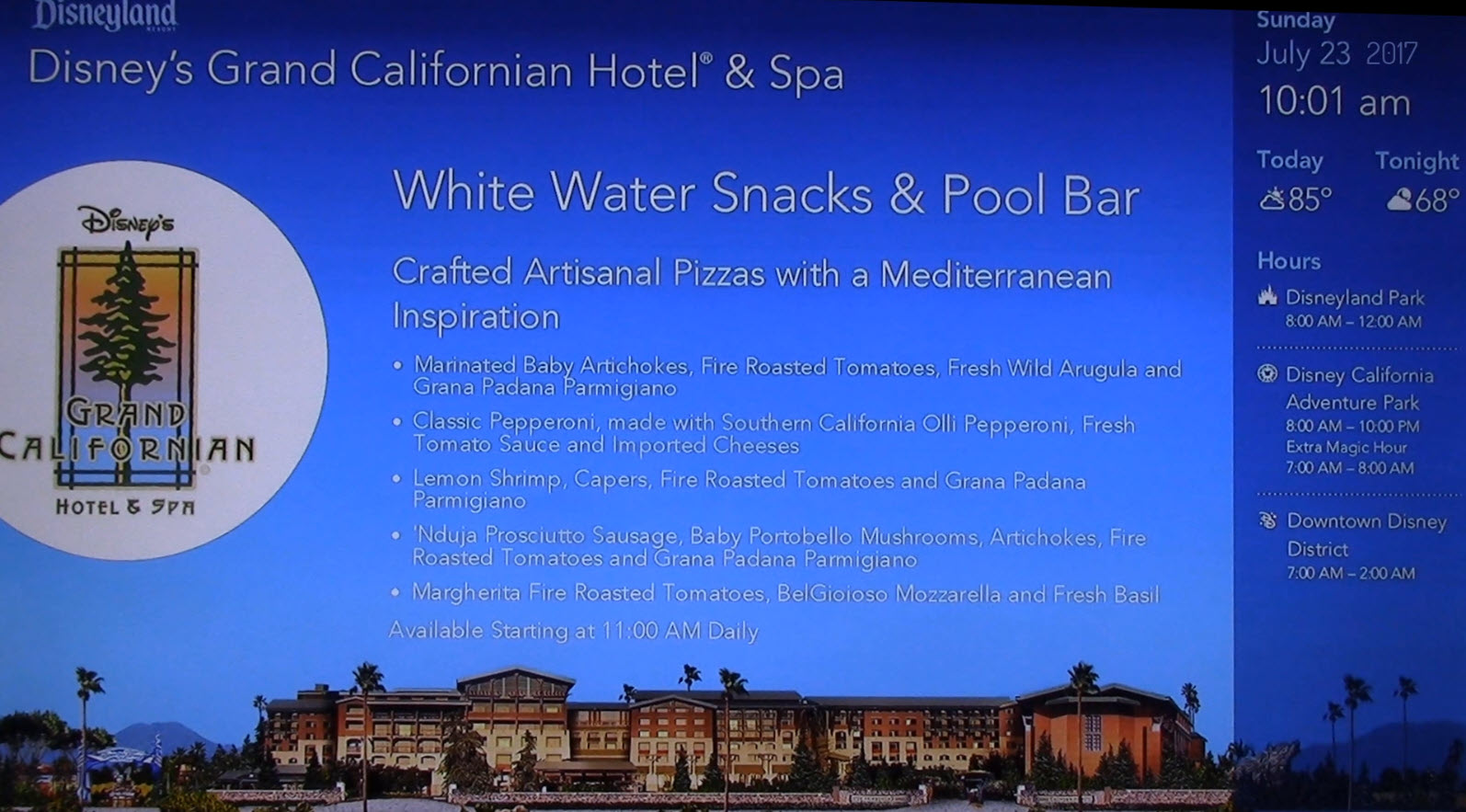 During July 2017, guests staying at the Disneyland Resort hotels were greeted each morning with Disneyland Today, a dedicated in-room television program designed to kickstart their day. More than just a promo reel, this daily broadcast was a helpful and entertaining guide to everything happening across the Disneyland Resort.