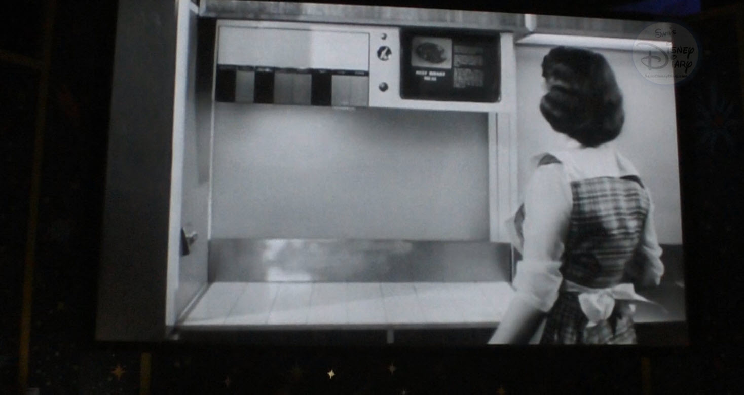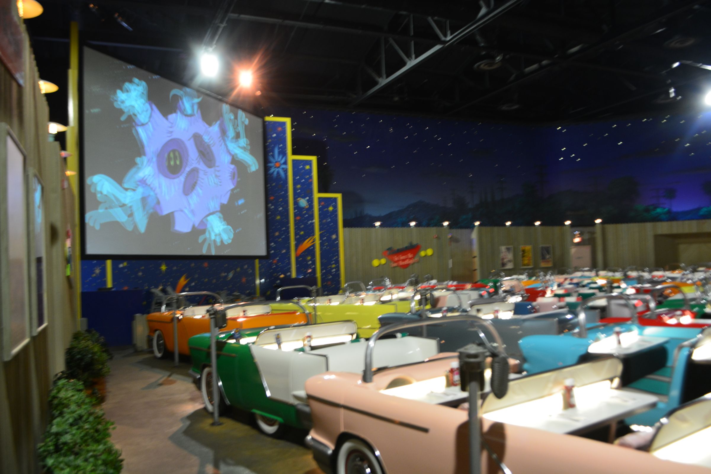 The Sci-Fi Dine-In isn’t just about burgers and shakes (though the burgers are excellent). It’s about the atmosphere, where guests dine in retro roadsters under a simulated night sky, watching a curated loop of mid-century sci-fi film clips, retro commercials, vintage animation, and even a few surprises featuring Walt Disney himself.