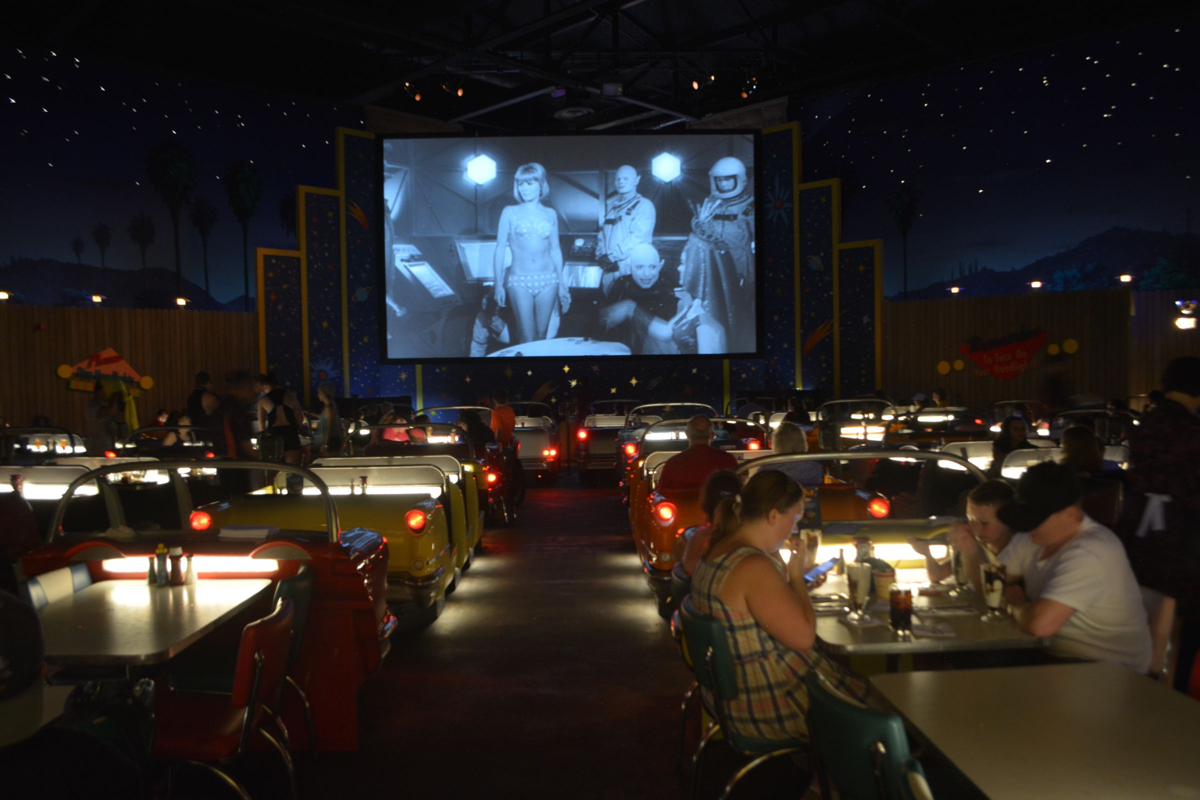 Step back in time at the Sci-Fi Dine-In Theater, where vintage clips, monster movies, and mid-century charm roll across the big screen.