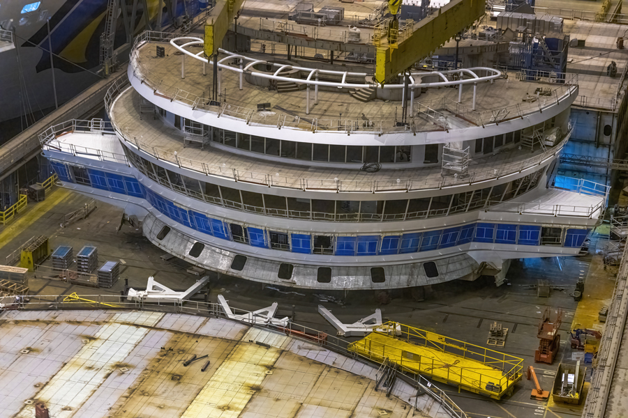 Construction continues on the Disney Wish, with the wheelhouse and final bow piece now installed. The ship is set to sail in June 2022.