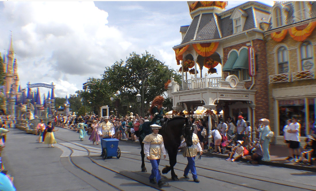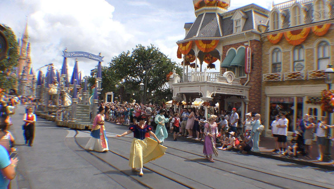 This video also includes a Disney Princess Cavalcade featuring beloved royals like Cinderella, Tiana, Ariel, Belle, and Rapunzel. Gliding down Main Street in a beautifully decorated float, creating picture-perfect moments and fairy tale memories.