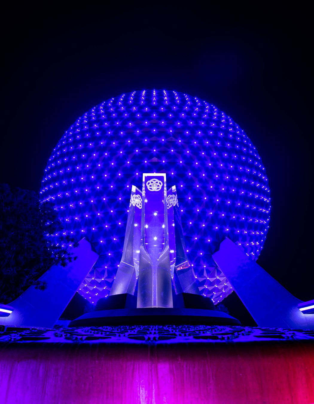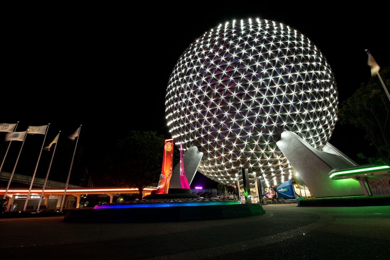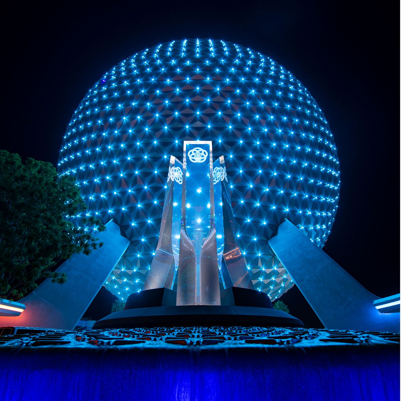 The most dramatic transformation happens at EPCOT, where Spaceship Earth now features a brand-new lighting package. Dozens of new points of light shine across its reflective surface, connecting like stars in a nighttime sky. The permanent lighting effect—unveiled for the 50th anniversary—symbolizes hope, progress, and unity.