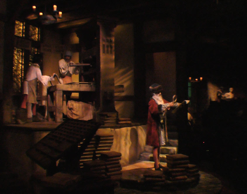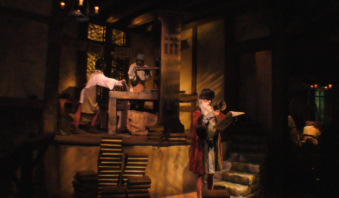 The journey begins with a look at early civilization. Guests witness humans communicating through cave paintings. As the ride continues, it highlights the development of the Phoenician alphabet and the power of the Roman Empire. The experience then moves through the Renaissance and Industrial Age.