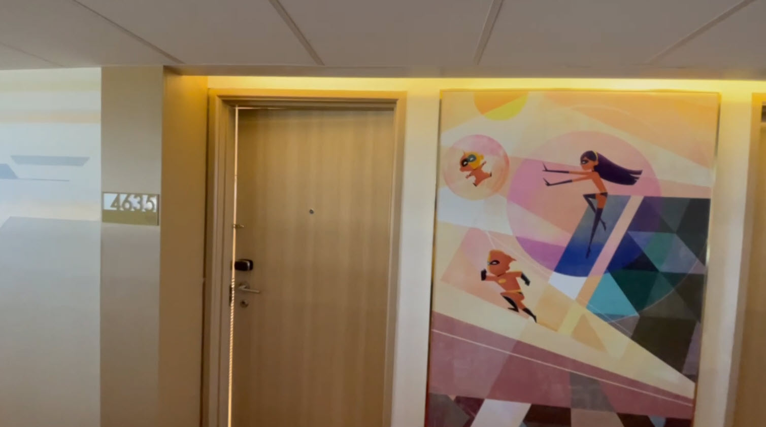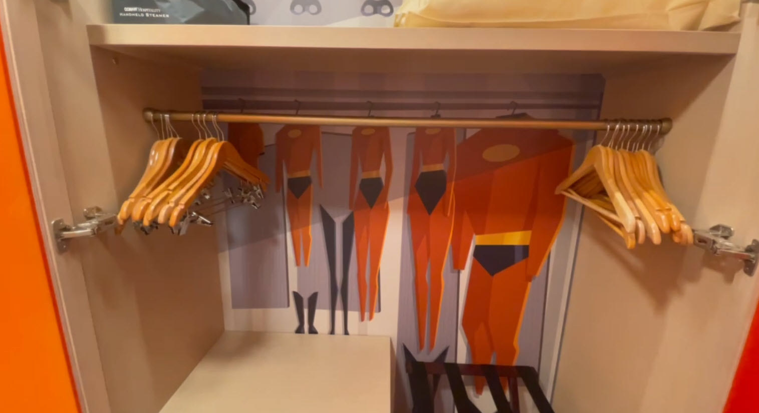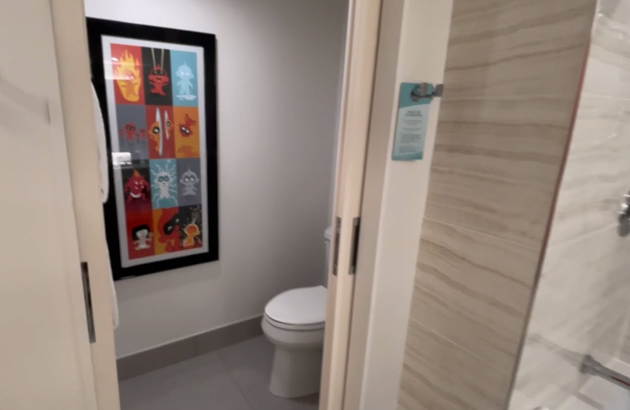 Our video tour captures the experience, including close-ups of custom throw pillows with Mr. Incredible’s suit design, themed closet interiors with Jack-Jack and his cookies, and even bathroom tiles that reflect superhero motifs.