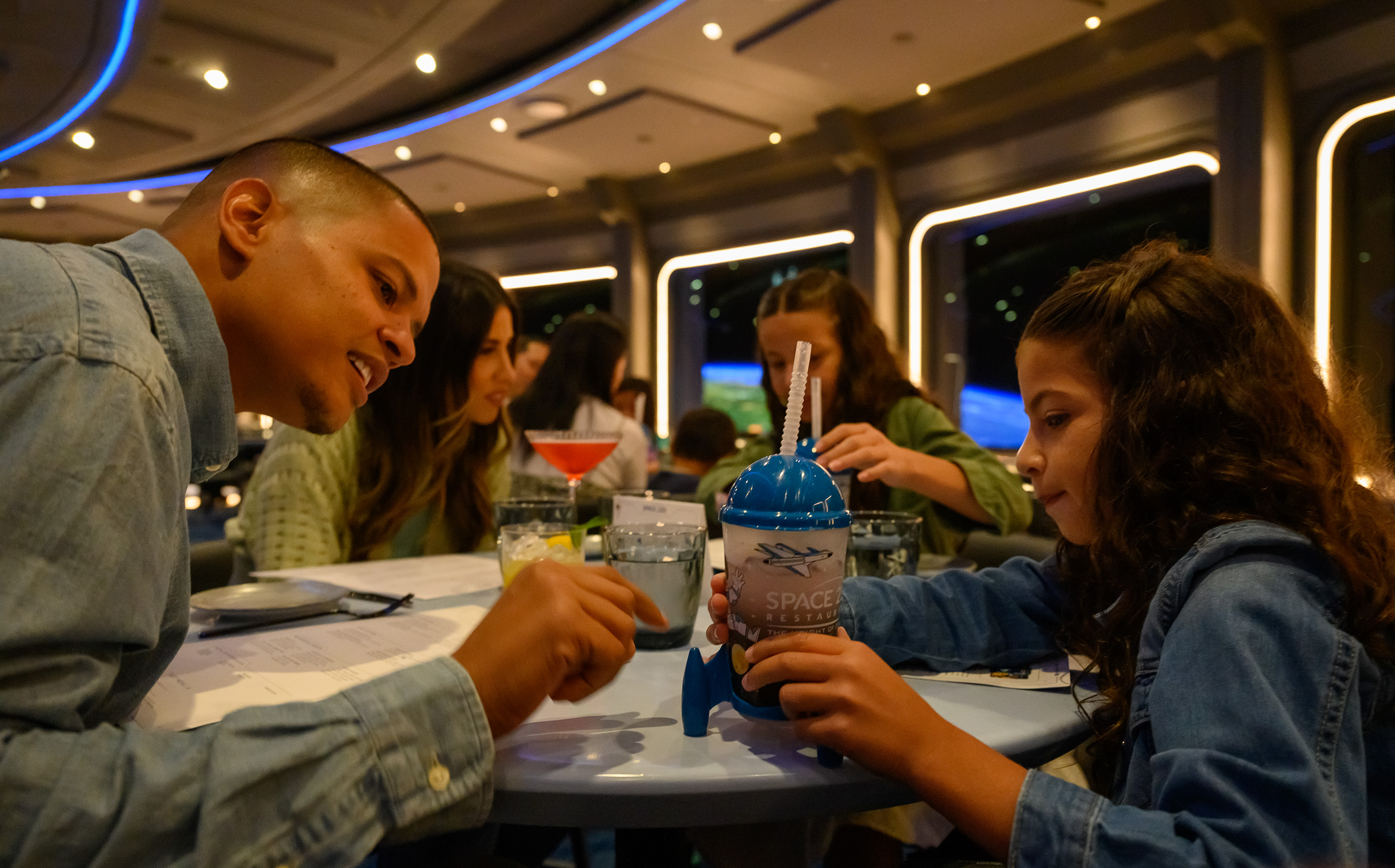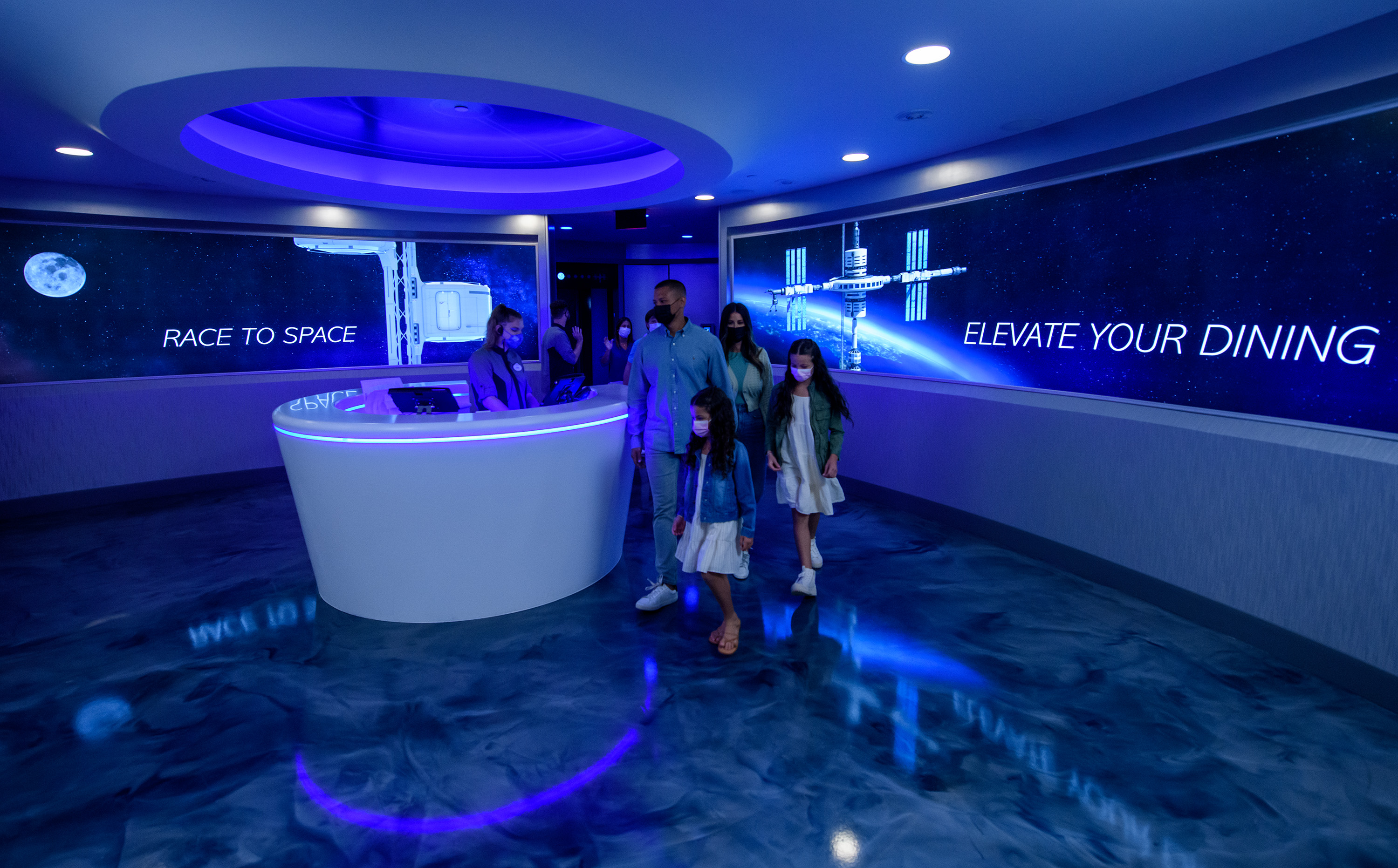 Once inside, diners are surrounded by panoramic windows that look out into space. Floating astronauts, orbiting satellites, and even a few Disney-themed Easter eggs pass by. The visual effects are seamlessly integrated into the environment, enhancing the sense of immersion.
