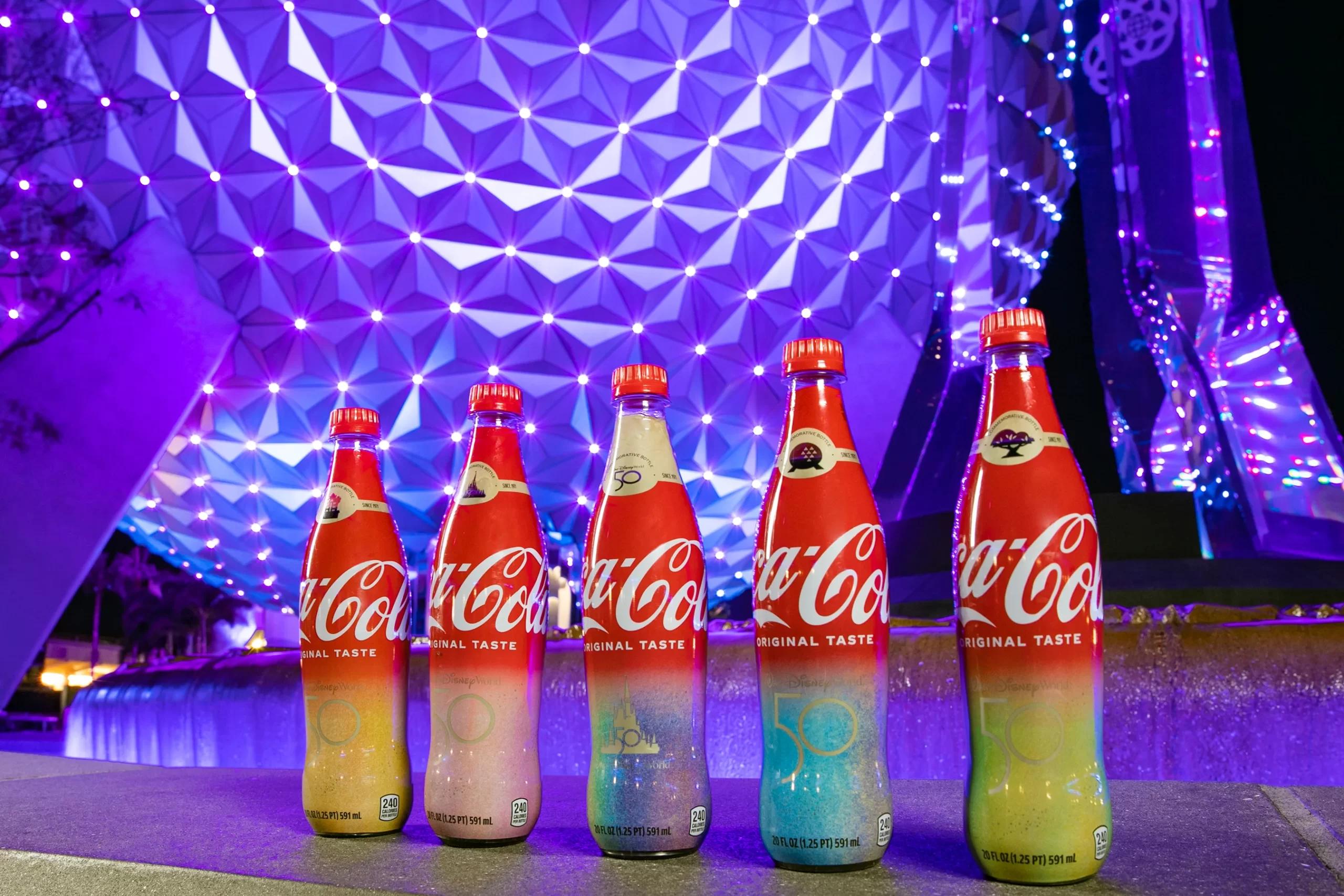 To celebrate the 50-year collaboration between Walt Disney World Resort and Coca-Cola, five unique co-branded collectible bottles are now available exclusively at the resort during the 50th Anniversary Celebration.