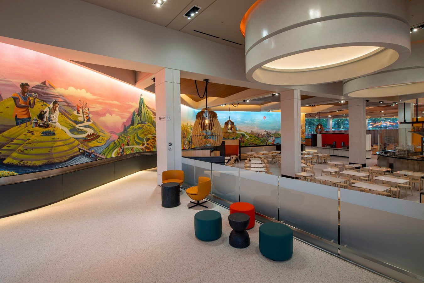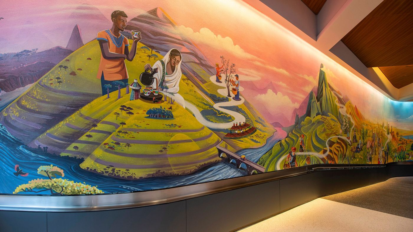 One of the standout features inside Connections Eatery is the striking mural stretching over 160 feet of the back wall. This hand-painted work celebrates the cultivation of food around the globe, with visuals of farming, fishing, and baking practices from multiple cultures.