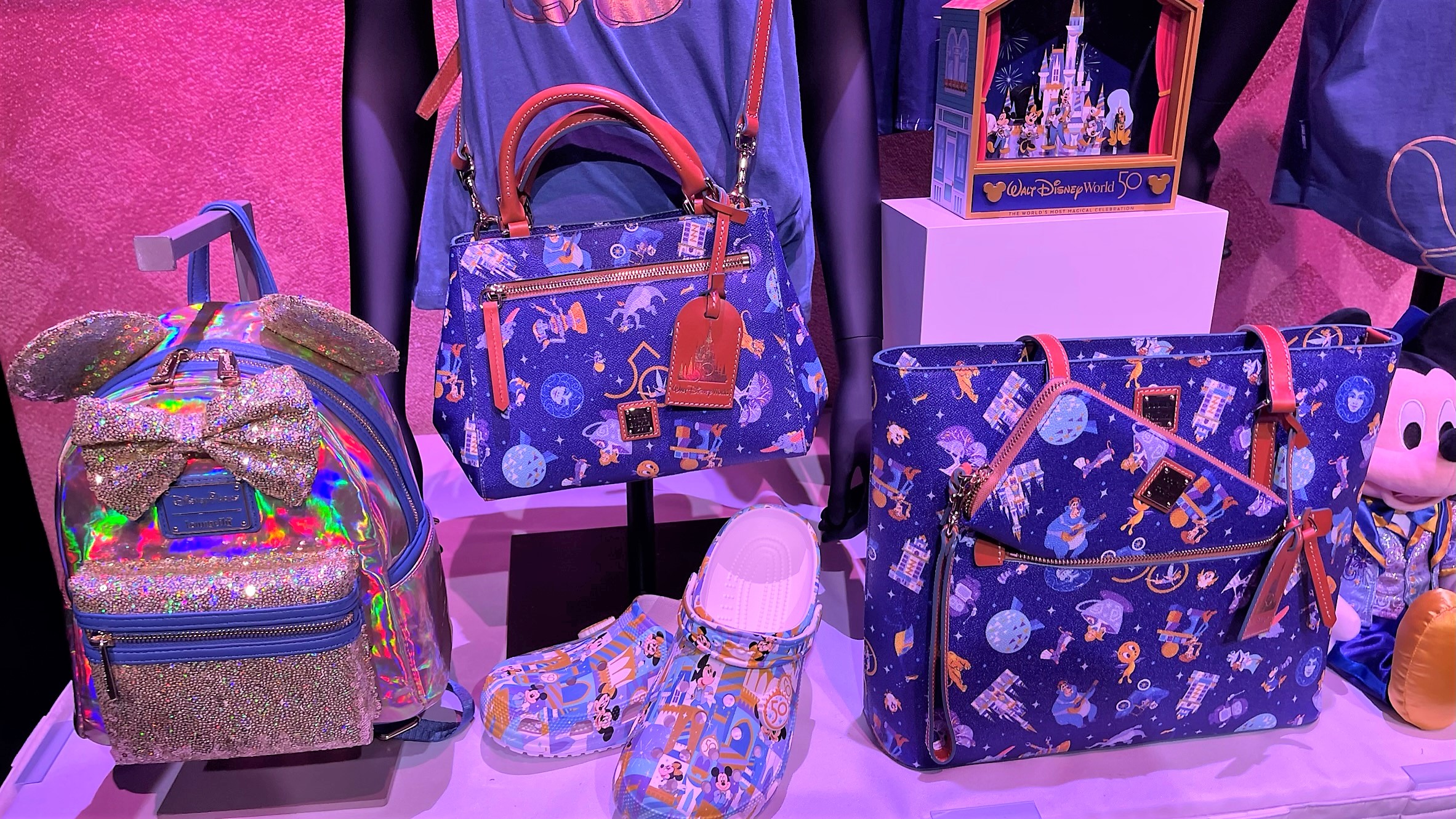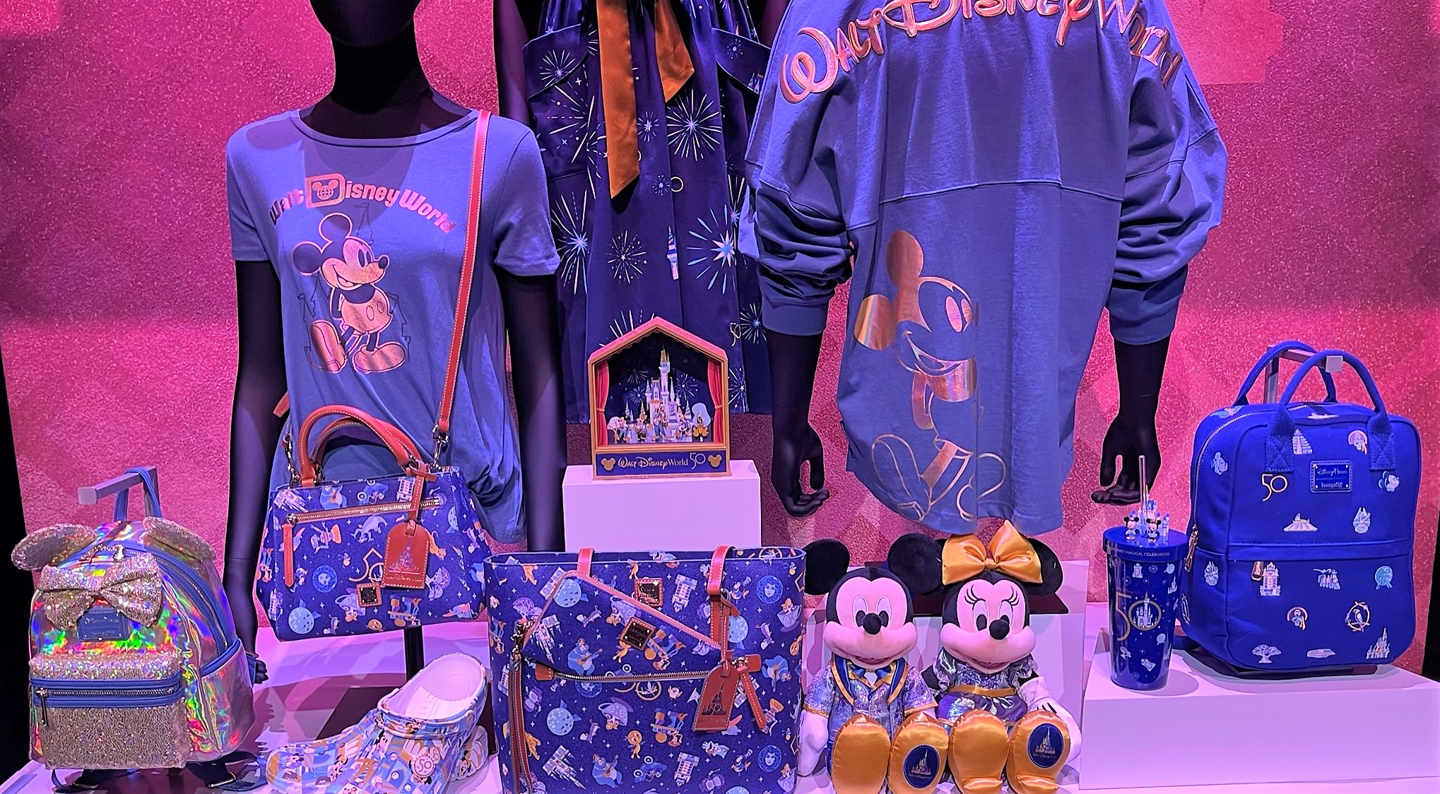 The EARidescent Collection and Shimmer Collection draw inspiration from the festive décor seen throughout Walt Disney World during the 50th-anniversary celebration. From dazzling Minnie Mouse headbands to Spirit Jerseys and Loungefly backpacks, these collections add sparkle and magic to your Disney wardrobe.