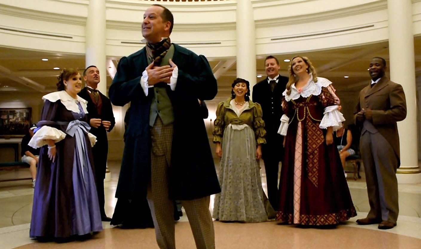 The Voices of Liberty performs classic American songs celebrating the nation’s rich history. Dressed in period costumes, they sing beneath the rotunda, making every performance feel intimate and special. Their show complements the patriotic themes of the American Adventure attraction.