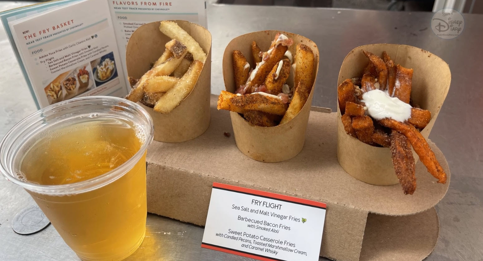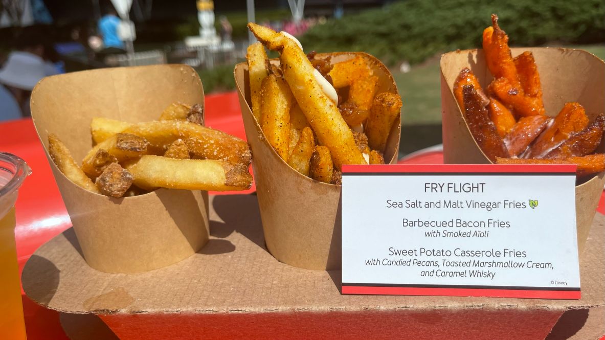 2022 Epcot International Food and Wine Festival | The Fry Basket debuts with a “Fry Flight,” featuring Sea Salt and Malt Vinegar Fries, Barbecued Bacon Fries, and Sweet Potato Casserole Fries.