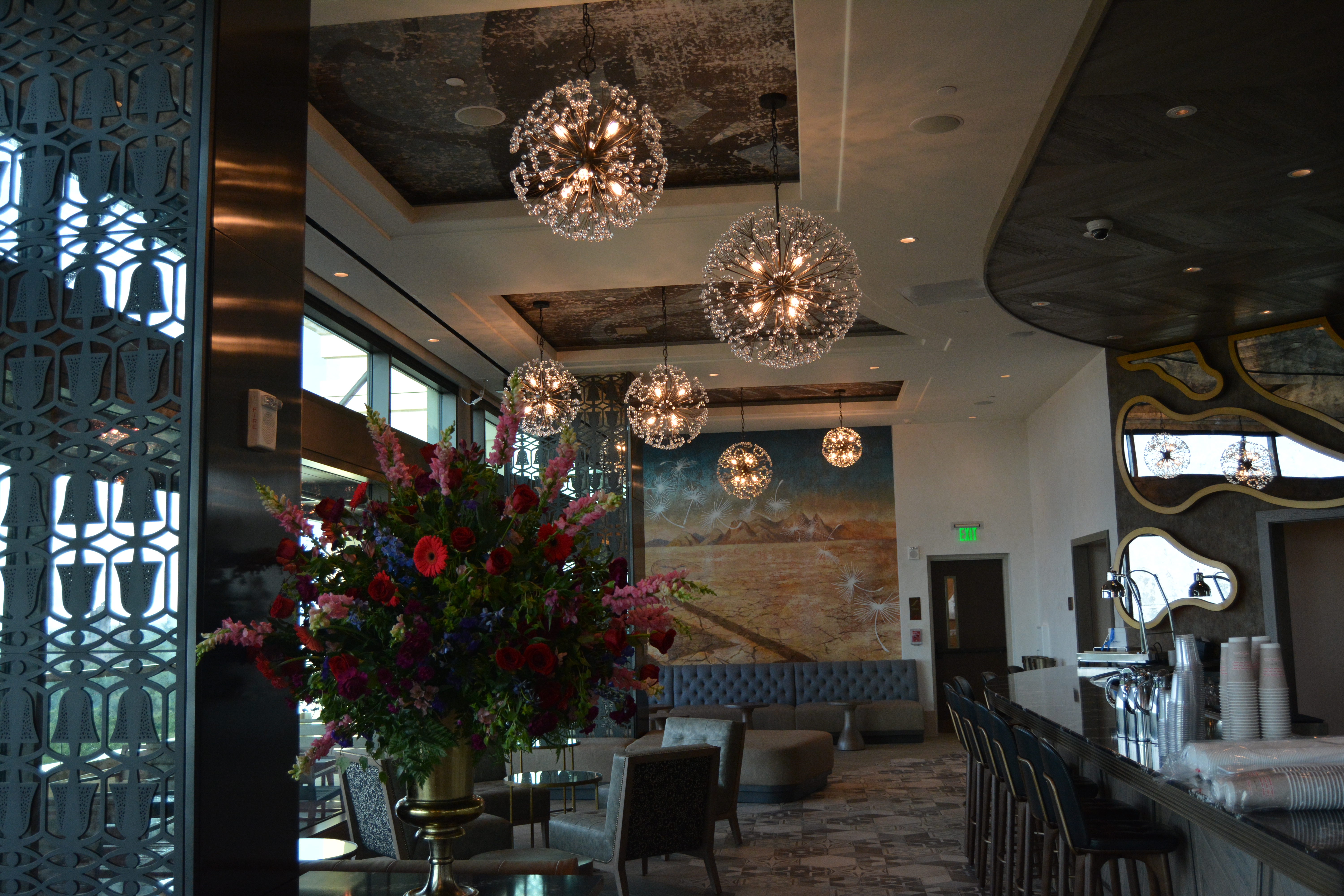 The animated short Destino tells the story of Chronos, a timeless being in love with the mortal woman Dahlia. The rooftop lounge named in her honor reflects her elegance and artistry. Dandelion-shaped chandeliers hang overhead, mirroring the fleeting nature of time, while bell-shaped light fixtures and swirling ceiling patterns echo her flowing hair. The entire space feels like a work of art come to life.