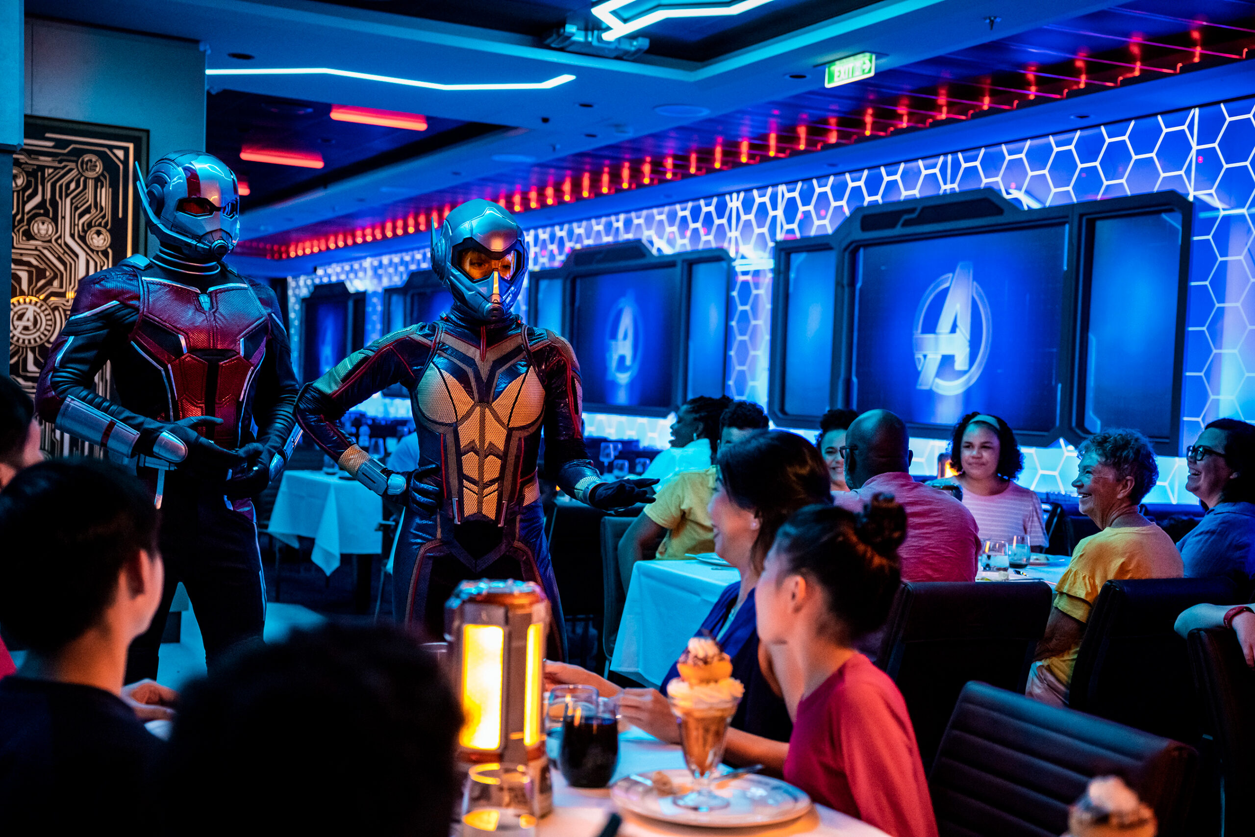 At Worlds of Marvel, diners become part of an Avengers mission. The dining room transforms into a hub of action, where guests join Marvel superheroes to save the day. The adventure unfolds through immersive screens and special effects, making diners feel like they are in the heart of a Marvel film. With appearances from iconic characters like Ant-Man, The Wasp, and Captain America, every moment adds excitement to the meal.
