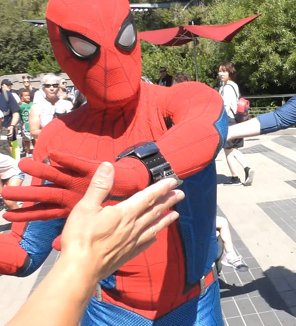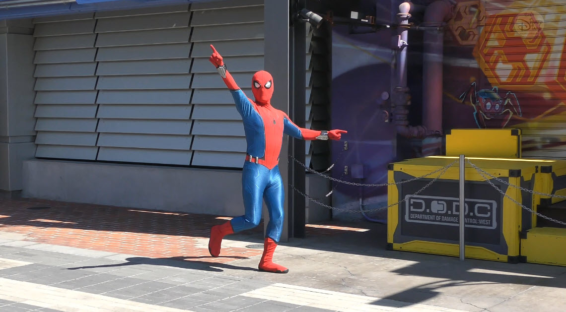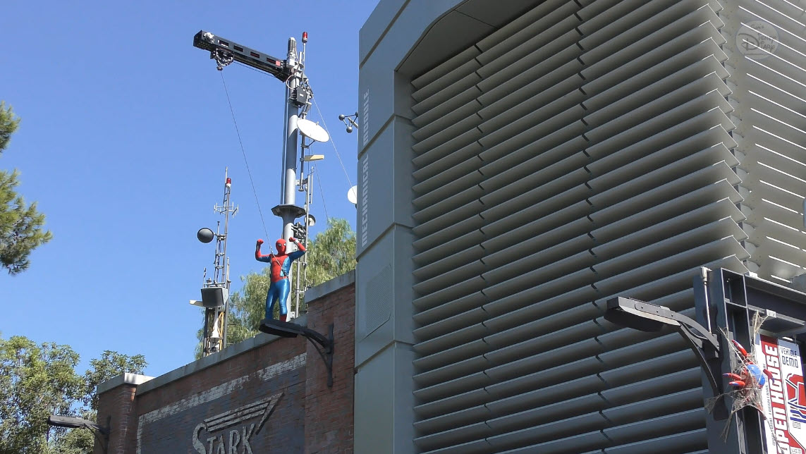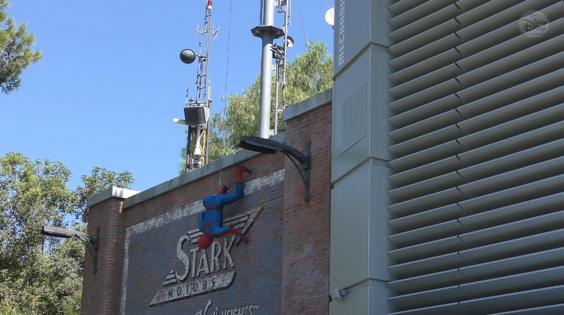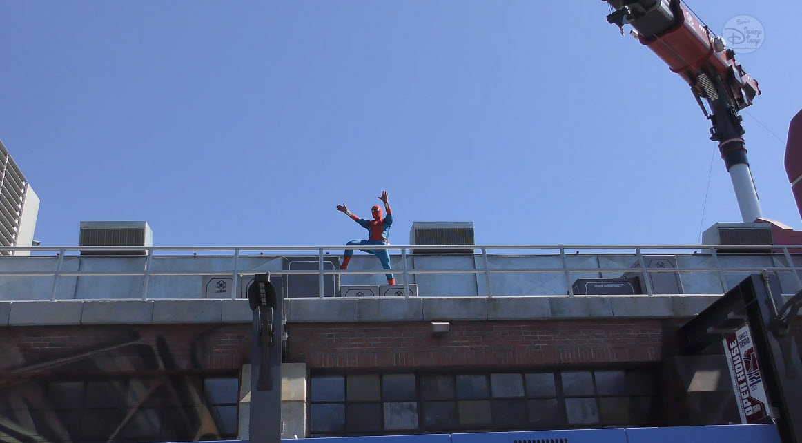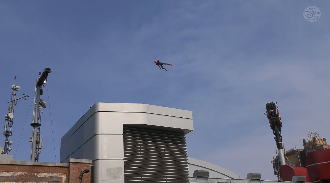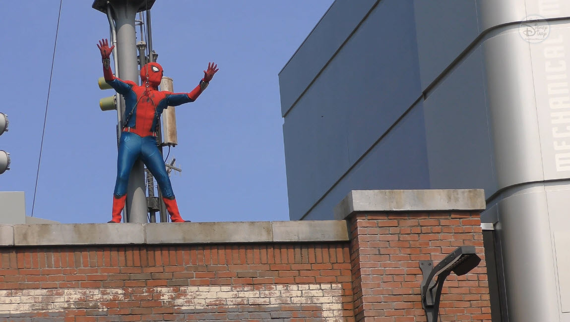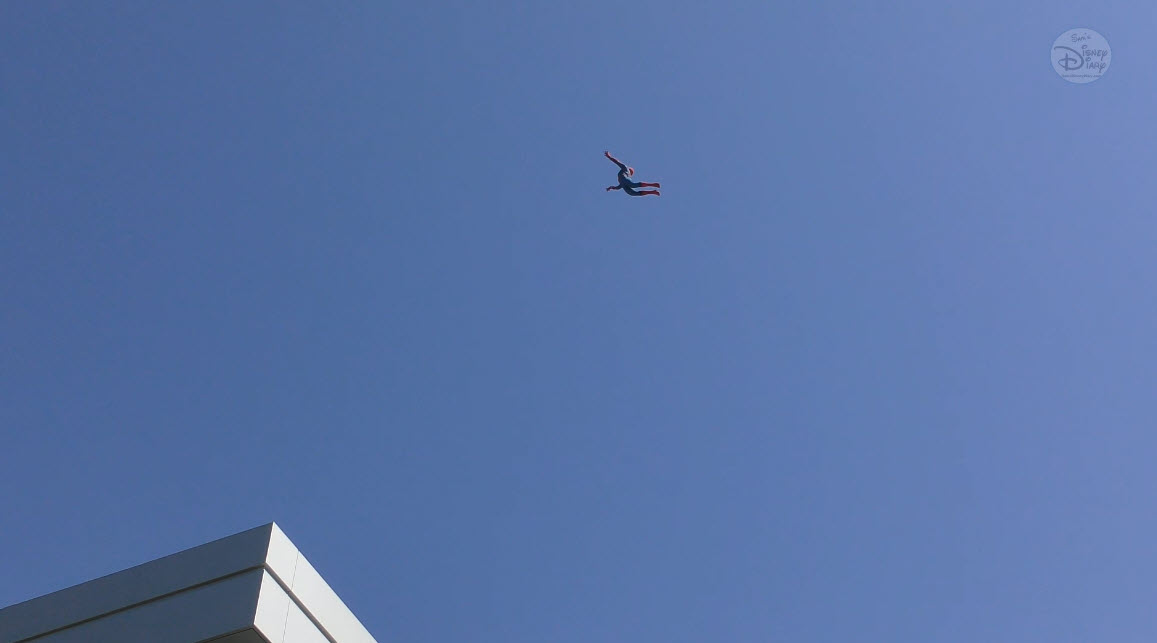 Multiple times a day, Spider-Man makes a high-flying entrance atop the WEB (Worldwide Engineering Brigade) building. He greets recruits, tests enhancements to his suit, and then launches into a thrilling rooftop leap. The aerial flip that follows is performed not by a live actor, but by Disney Imagineering’s Stuntronic robot — a groundbreaking autonomous figure that flies through the air with stunning realism.