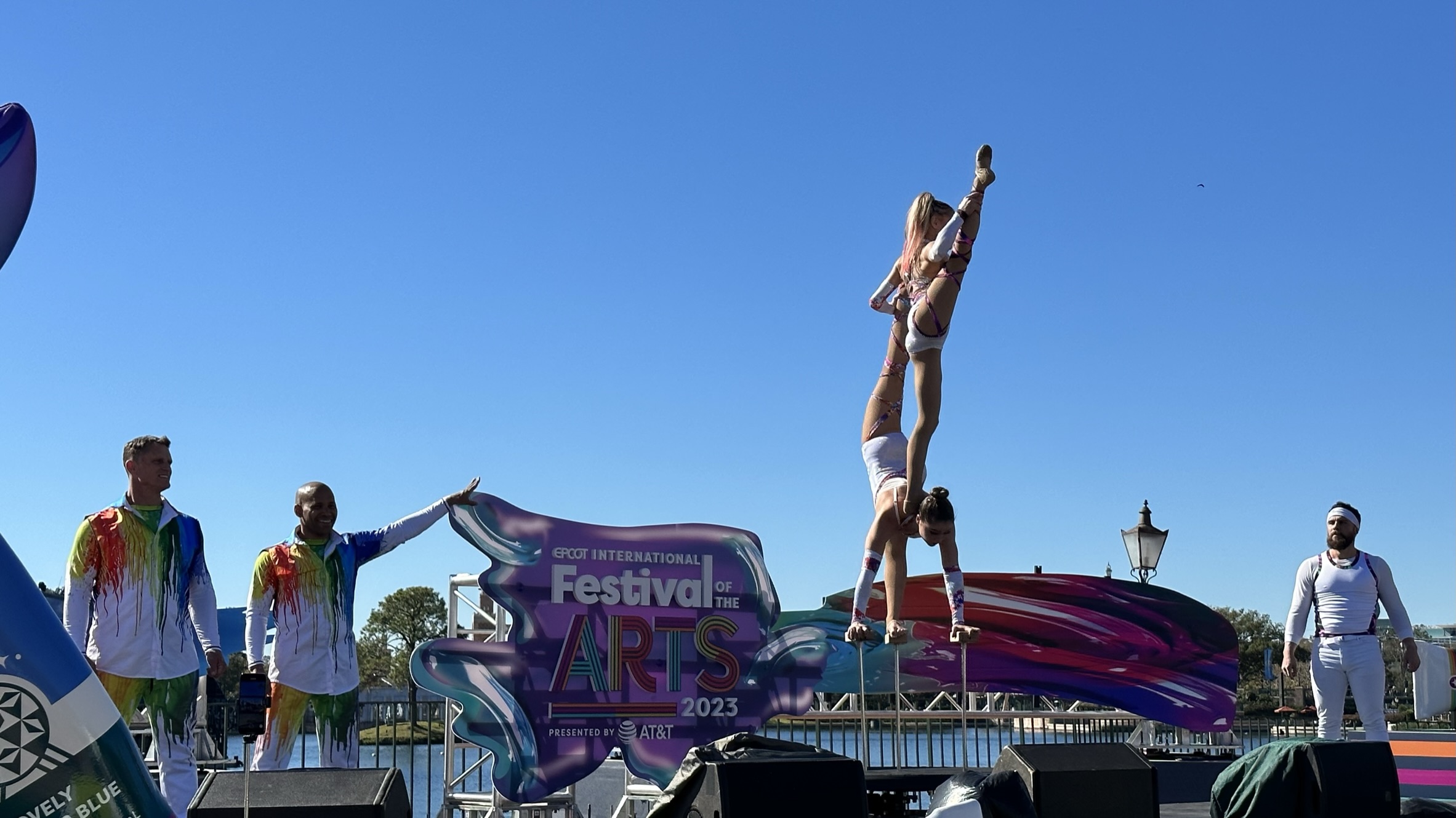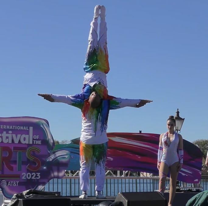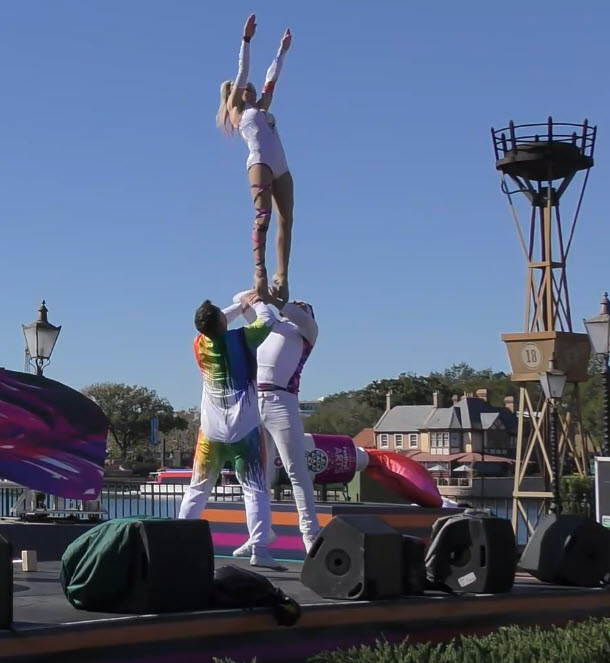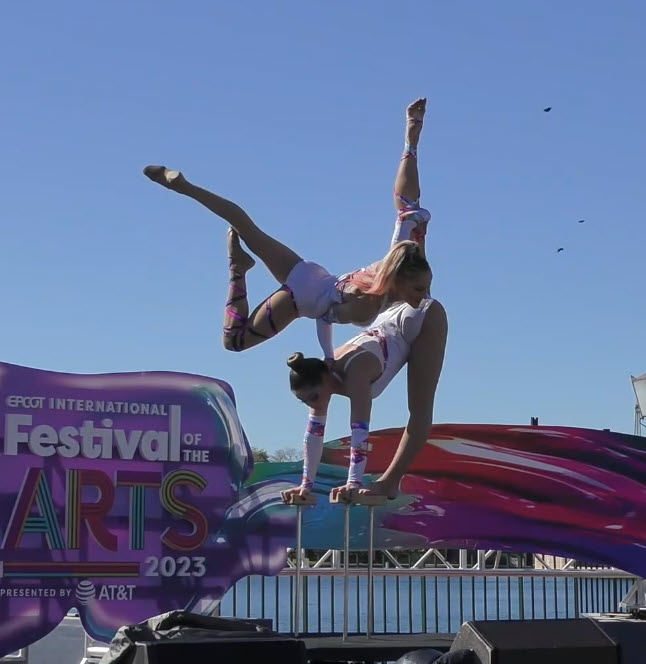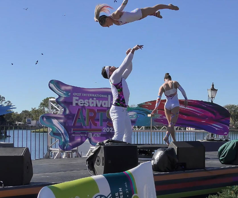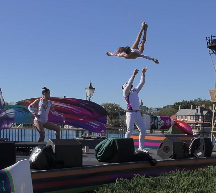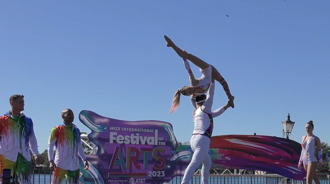 Experience the awe-inspiring Art Defying Gravity performance at the Epcot International Festival of the Arts 2023. This captivating show features thrilling acts of strength and agility, showcasing performers who push the boundaries of physical artistry.