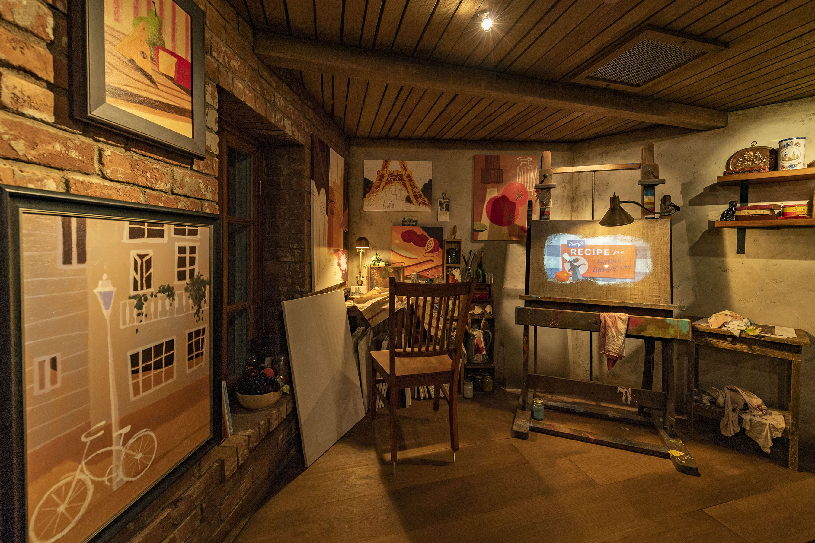Guests enter a French artist’s loft featuring French-inspired paintings, cupboards filled with art supplies and two magical canvases that come to life in the queue for Remy’s Ratatouille Adventure in EPCOT at Walt Disney World Resort in Lake Buena Vista, Fla. (Matt Stroshane, photographer)