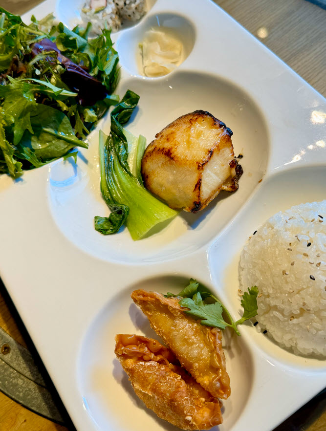 - Miso-Glazed Chilean Sea Bass with mixed green salad, crispy chicken dumpling (2) and kanikama sushi roll (2) for $29