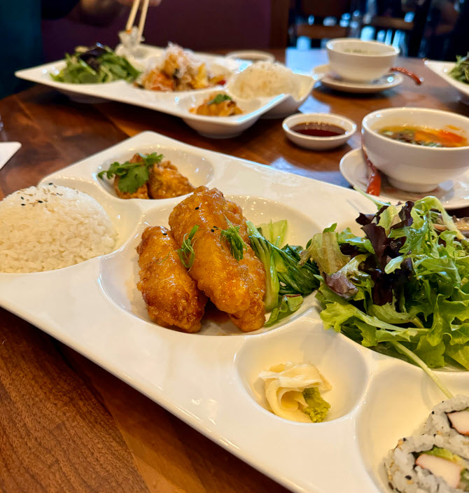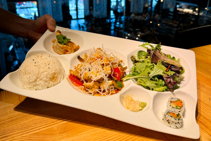 - Kung Pao Cauliflower with mixed green salad, crispy vegetable dumpling (2) and vegetable sushi roll (2) for $24