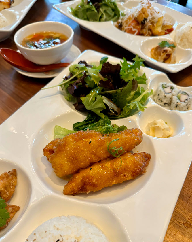 - Orange Chicken with mixed green salad, crispy chicken dumpling (2) and kanikama sushi roll (2) for $27