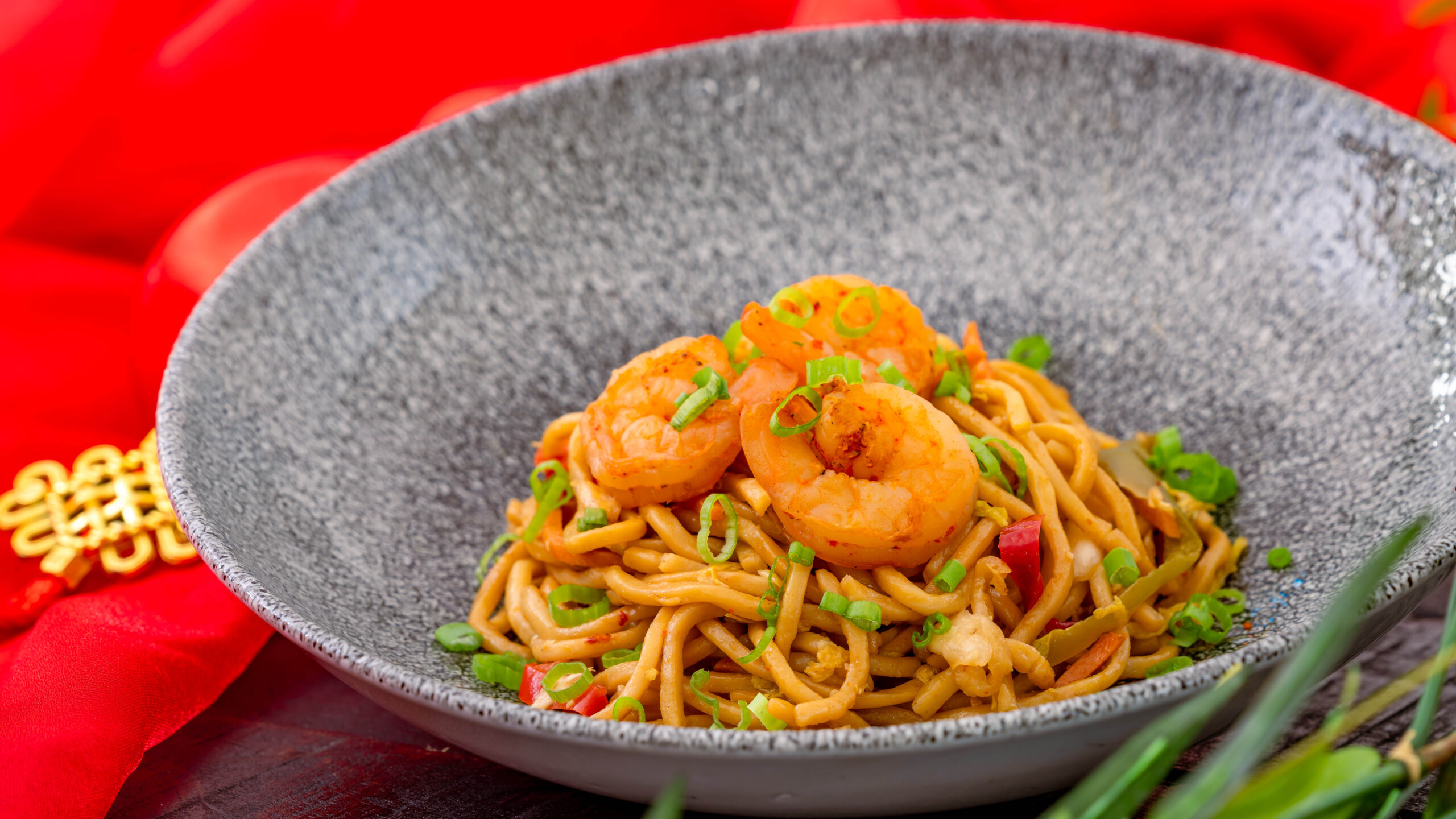 Shrimp Lo Mein Noodles (Longevity Noodle Co. at Disney California Adventure Park in Anaheim, Calif.) – pan-fried lo mein noodles with sautéed shrimp garnished with green onions. Available beginning Jan. 23, 2024. For more details, visit DisneyParksBlog.com. (David Nguyen/Disneyland Resort)