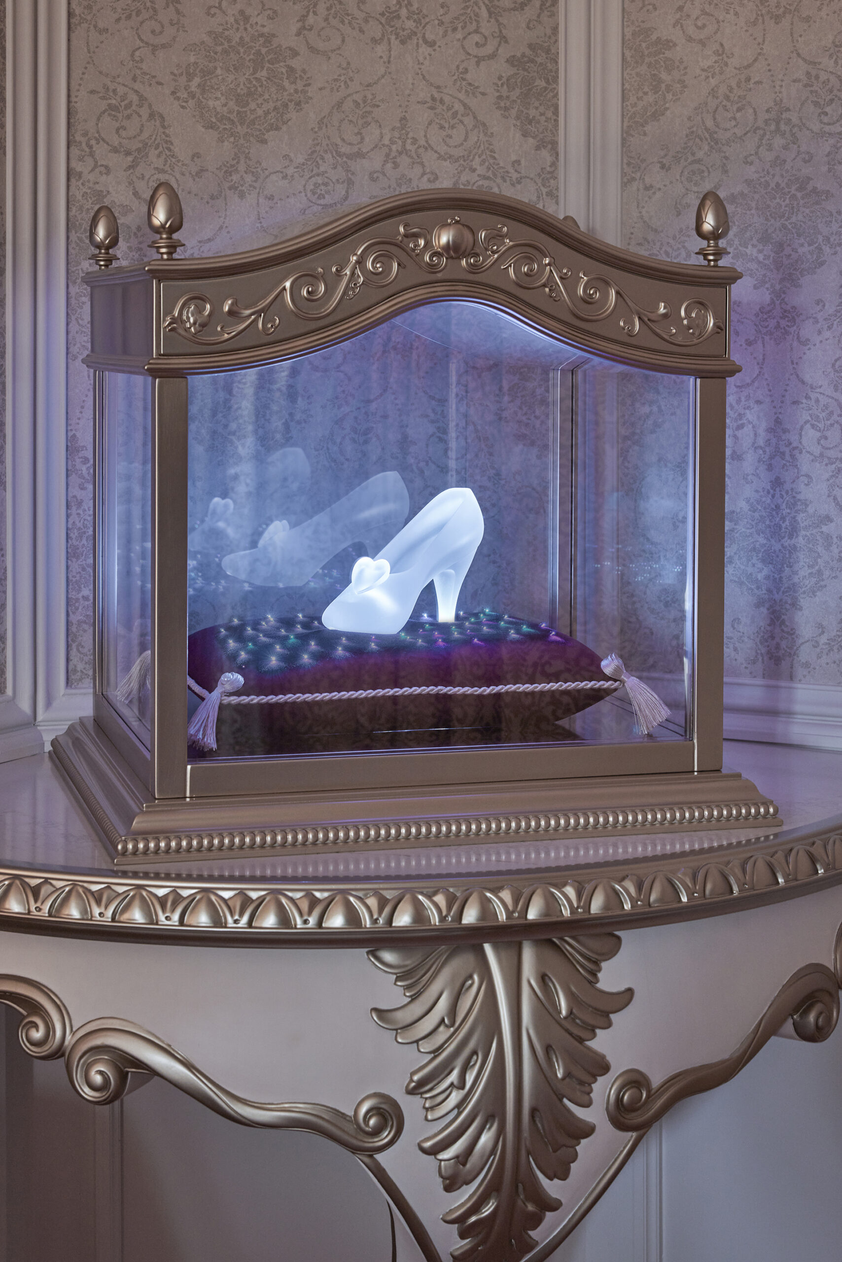 Upon entering the grand lobby, a Royal Greeter welcomes guests and invites them into the royal story. The architectural design draws inspiration from French castle libraries, with ivory and gold tones creating a regal atmosphere. A stunning chandelier made of Bohemian crystal—representing Sleeping Beauty Castle—anchors the space. Expert glassmakers in the Czech Republic crafted this intricate piece, blending traditional craftsmanship with modern technology.