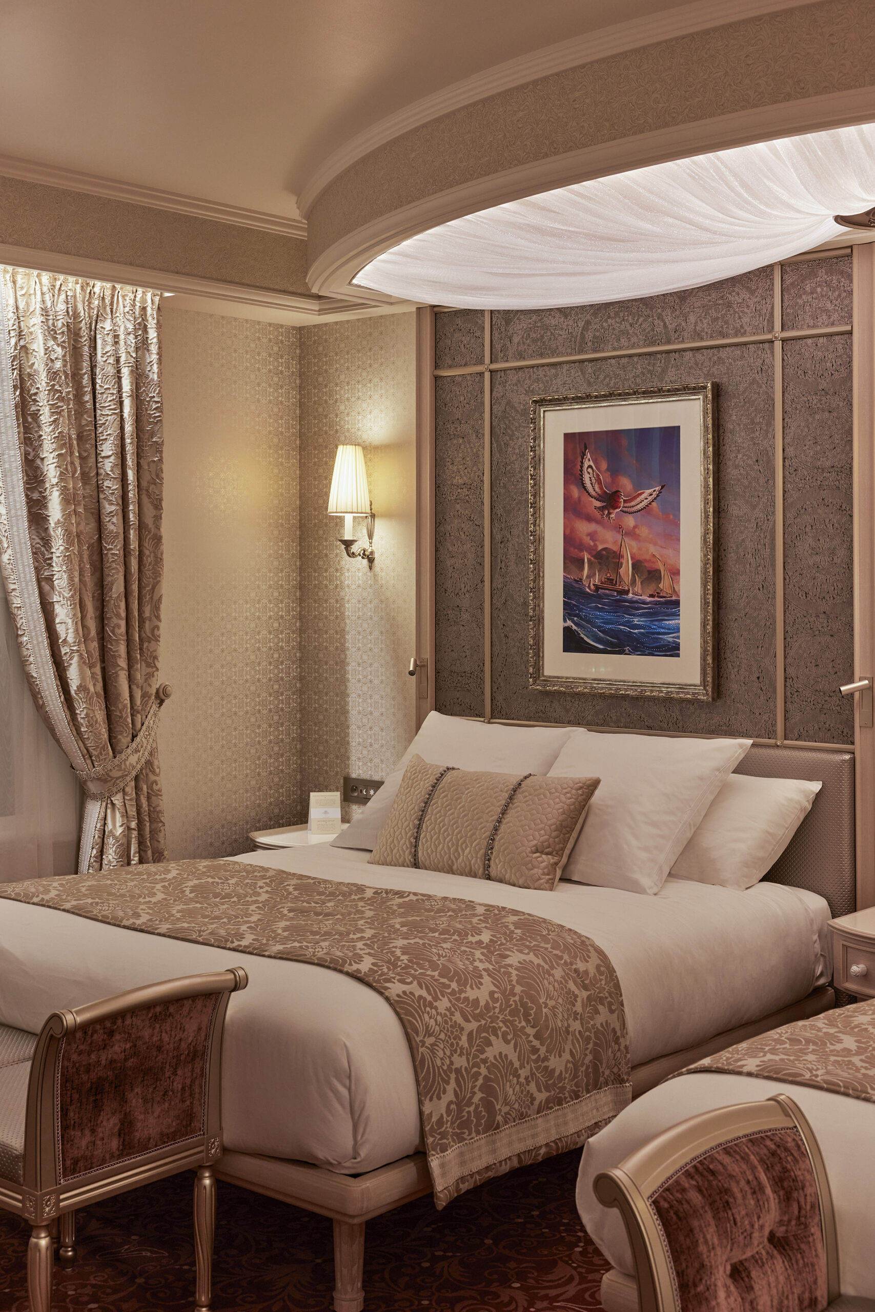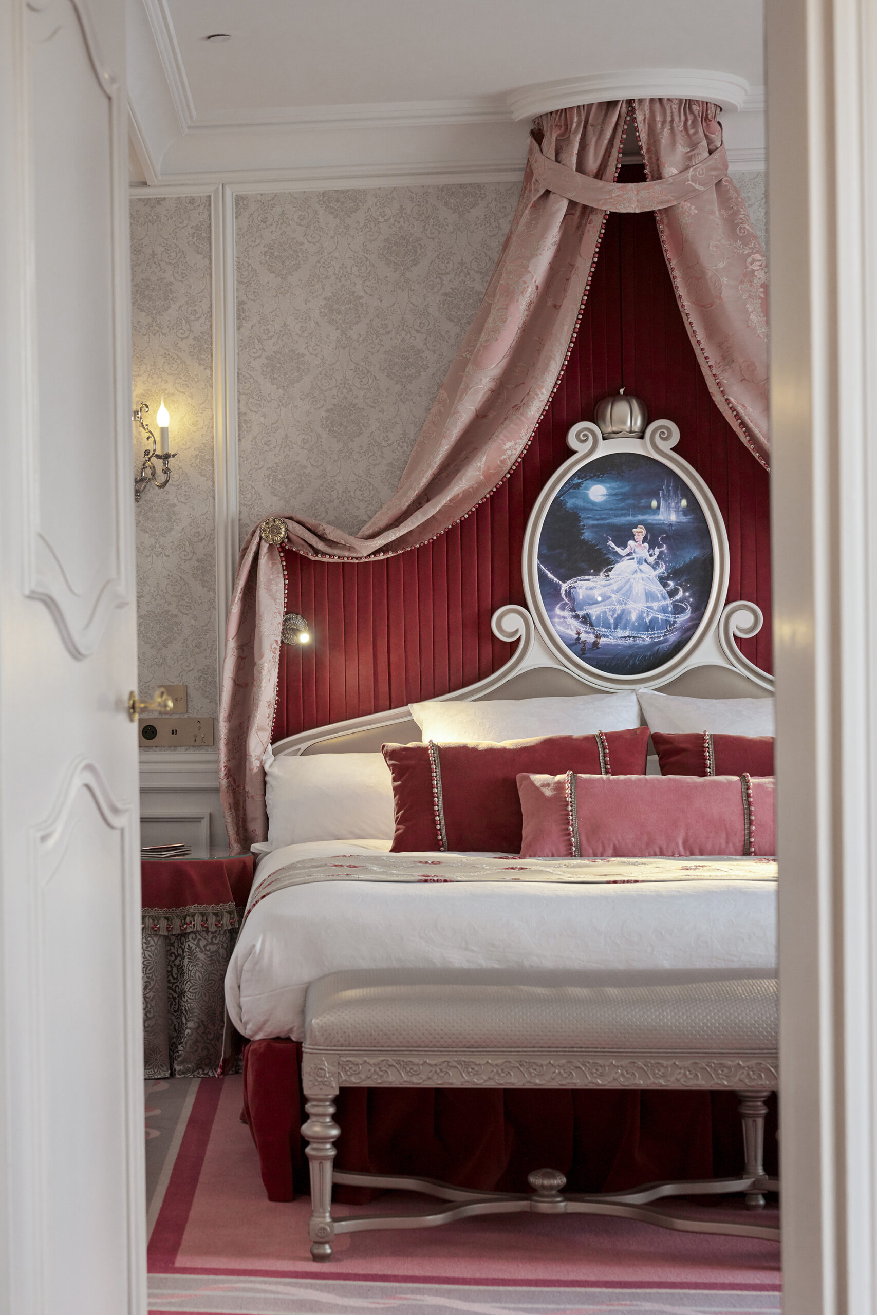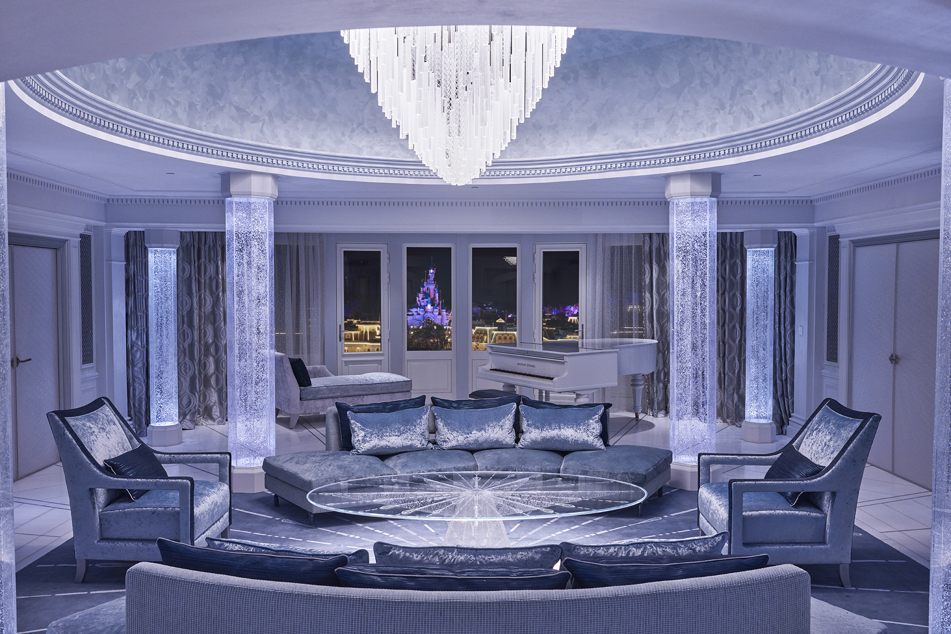 Cinderella Signature Suites With designs inspired by Cinderella’s home, this suite has been imagined as a boudoir: elegant furniture and materials with a soft and powdered color palette – pink in the bedroom, blue and ivory in the living room.
