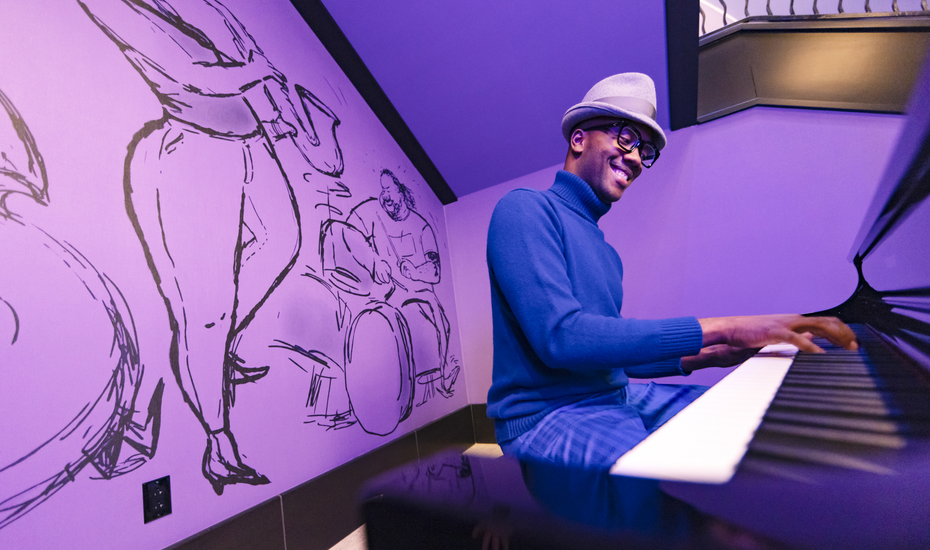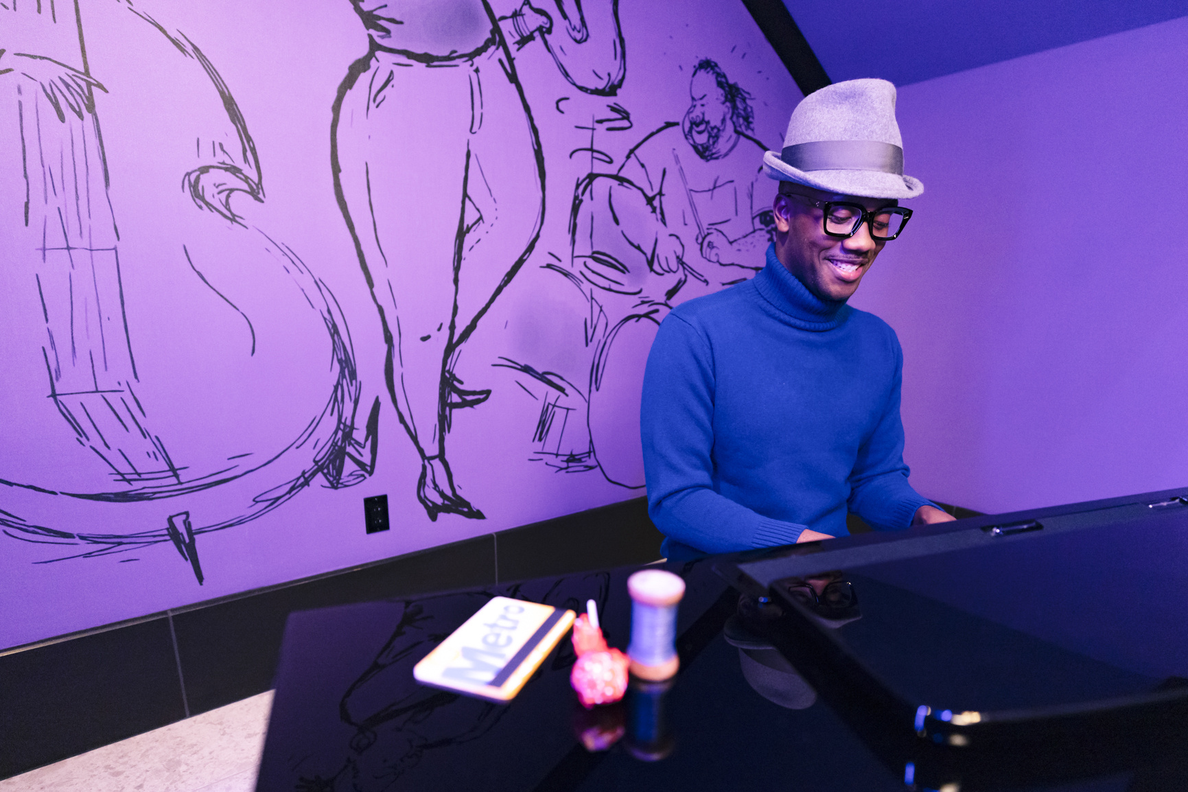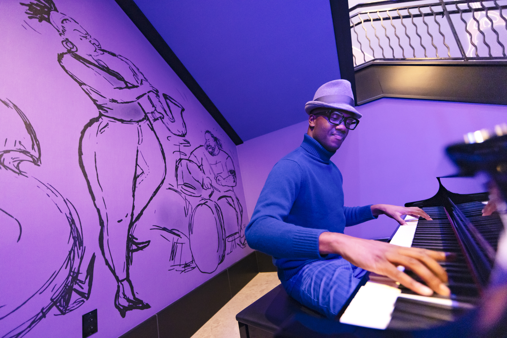 At select times, Joe Gardner from Pixar’s “Soul” drops by the hotel lobby to play piano for passing guests at Pixar Place Hotel at Disneyland Resort in Anaheim, Calif. Joe Gardner gets lost in the music surrounded by deep purple walls and drawings of jazz musicians and counselors from “The Great Before.” (Christian Thompson/Disneyland Resort)