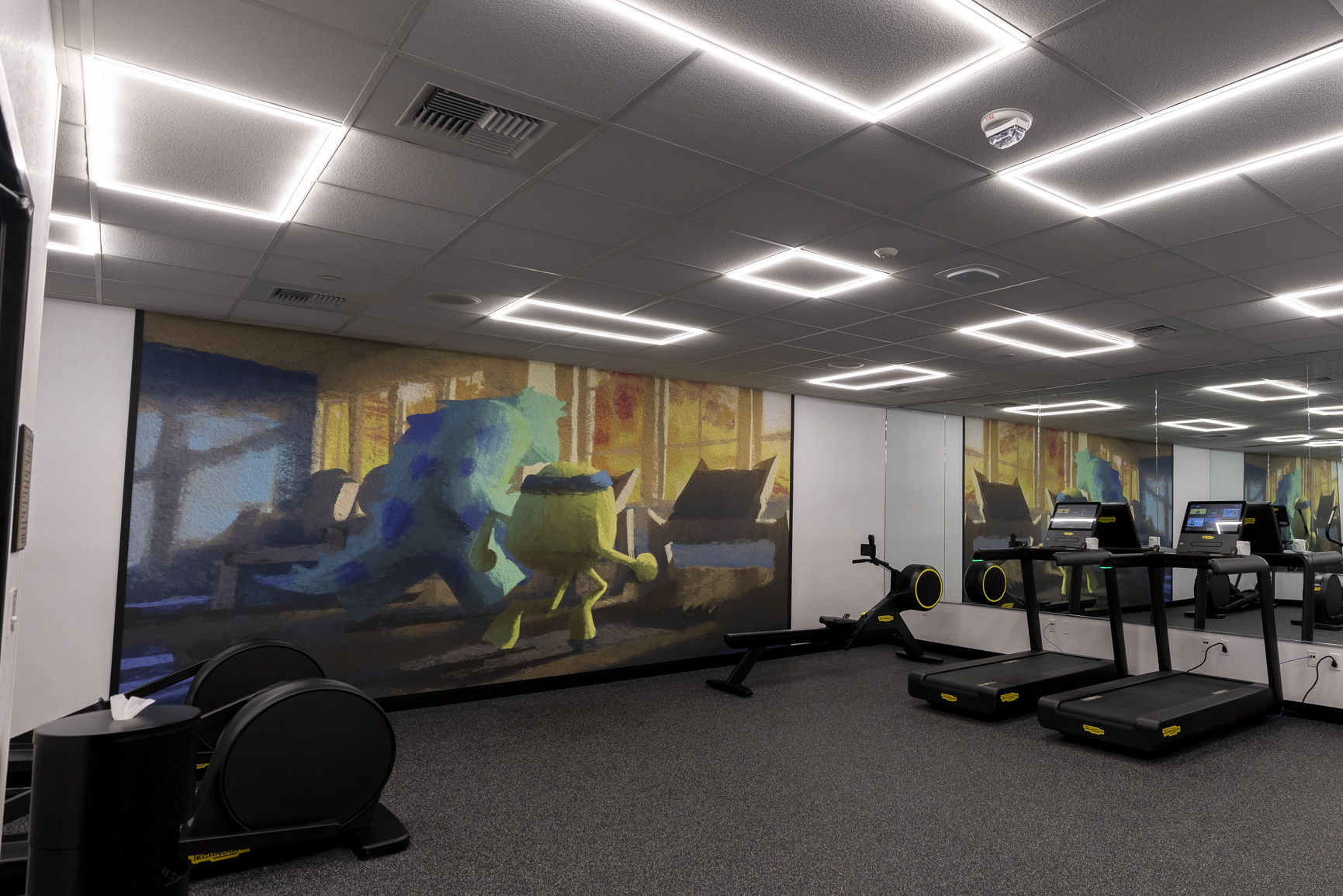 Hotel guests can enjoy a new and expanded fitness center featuring a mural of Mike and Sulley from “Monster’s University” running on a treadmill, inspired by Pixar’s “Monsters University.” (Christian Thompson/Disneyland Resort)