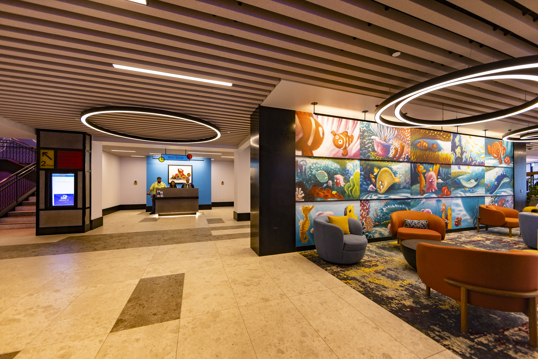 Featuring portraits and maquettes of iconic Pixar characters, the main lobby invites guests to begin their adventure amid a vibrant and colorful blend of different art galleries at Pixar Place Hotel at Disneyland Resort in Anaheim, Calif. (Christian Thompson/Disneyland Resort)