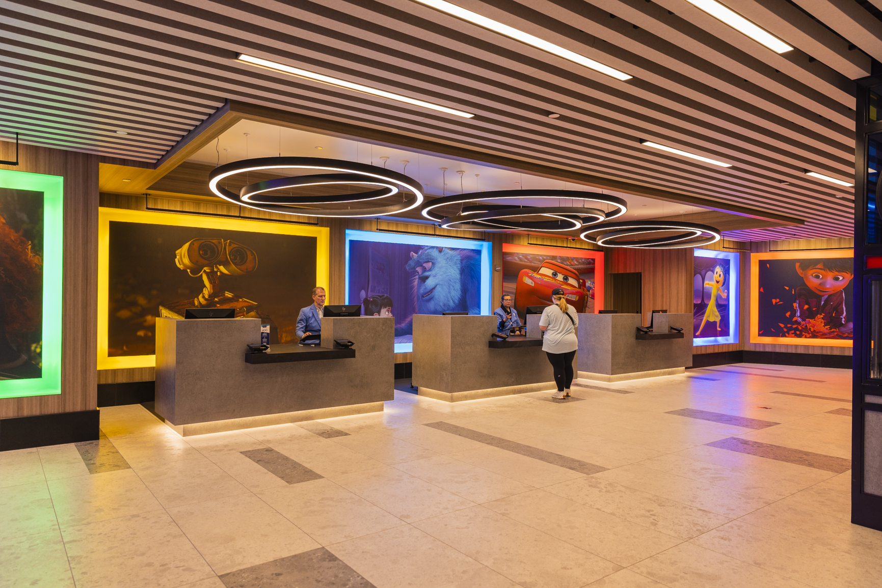From the moment you arrive, the Pixar magic begins. Guests are greeted by a sculpture of the Pixar Lamp and Ball at the entrance. Inside the lobby, colorful artwork spotlights beloved Pixar characters, and an animated mobile floats overhead. It’s the perfect first impression of this unique hotel experience.