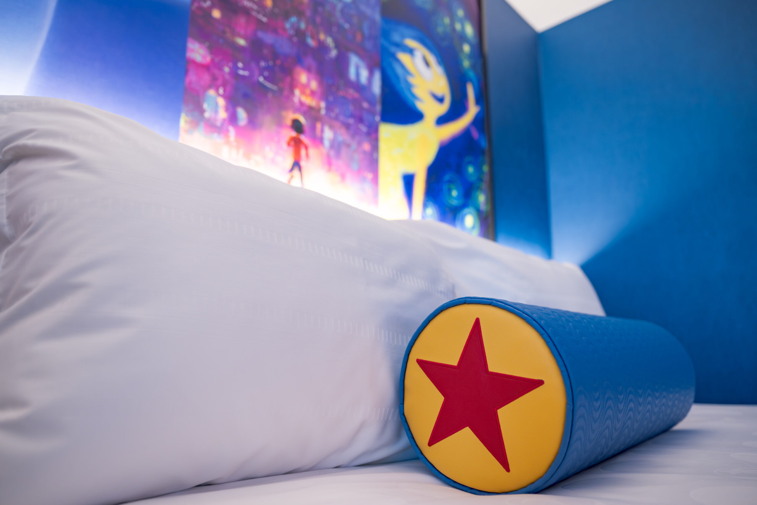 With whimsical nods to Pixar Animation Studios such as lighting reminiscent of the Pixar Lamp and pillows inspired by the Pixar Ball, guests can enjoy themed guest rooms in a comfortable and contemporary setting at Pixar Place Hotel at Disneyland Resort in Anaheim, Calif. (Richard Harbaugh/Disneyland Resort)