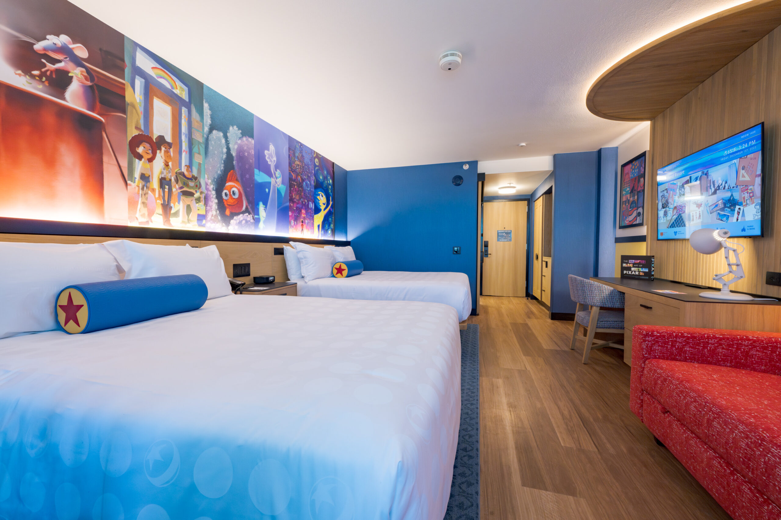 Each guest room features vibrant Pixar design elements, including curated artwork, concept art headboards, and fun nods like Pixar Ball pillows and lamp-style lighting. These comfortable, modern rooms are a cozy celebration of Pixar’s creative legacy.