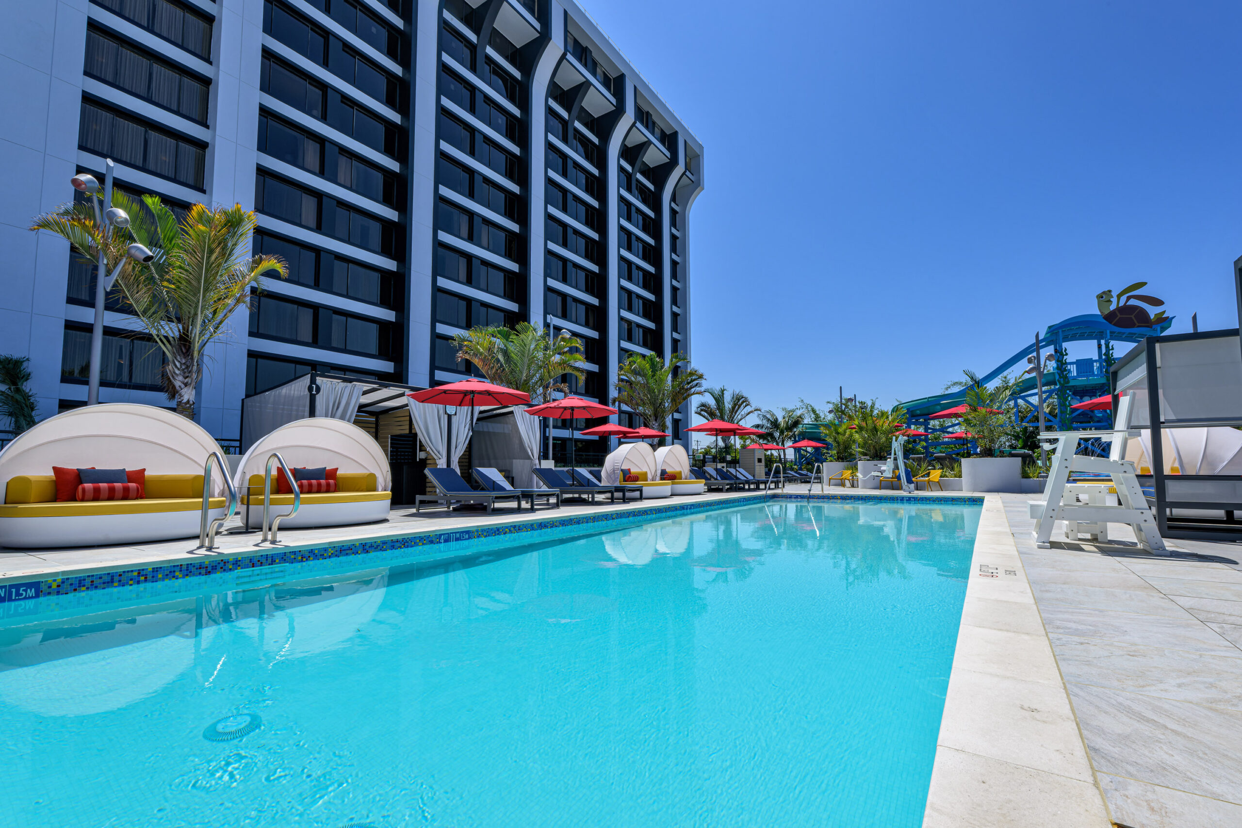 Families can unwind at Pixel Pool, zoom down Crush’s Surfin’ Slide, or cool off at Nemo’s Cove splash pad. Private daybeds and pods are available for rent, and fire pits inspired by Pixar characters offer a relaxing evening retreat.