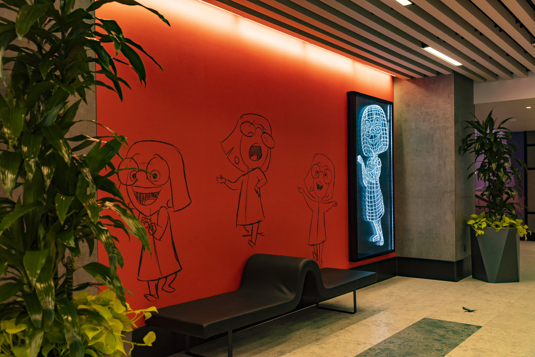 The rear entrance of Pixar Place Hotel at Disneyland Resort in Anaheim, Calif., welcomes guests with décor inspired by the stages of character design development as ideas go from pencil and paper illustrations to something built in the computer. (Christian Thompson/Disneyland Resort)