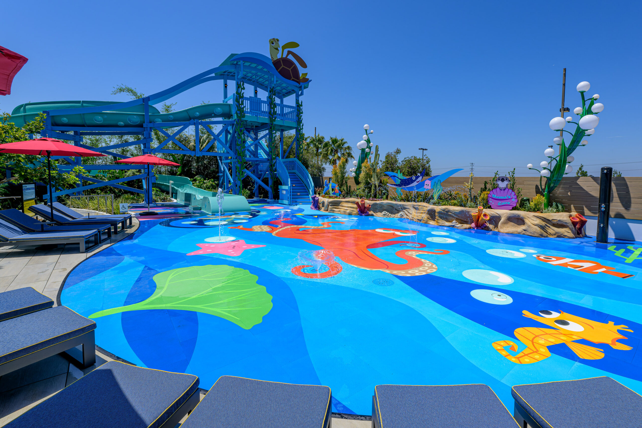 Hotel guests can enjoy a colorful water play area where families can splish and splash at Pixel Pool, take a winding water ride down Crush’s Surfin’ Slide and frolic with Hank on the pop-jet splash pad at Nemo’s Cove at Pixar Place Hotel at Disneyland Resort in Anaheim, Calif. (Richard Harbaugh/Disneyland Resort)