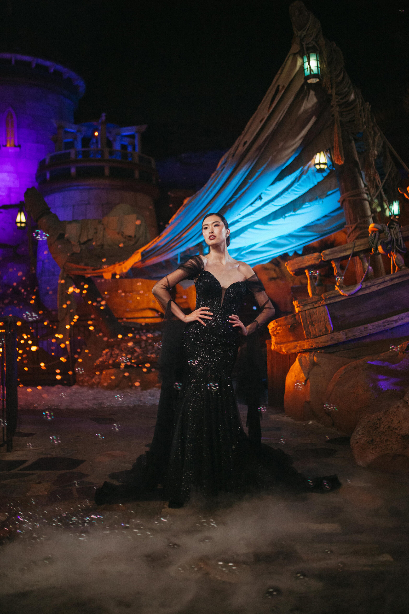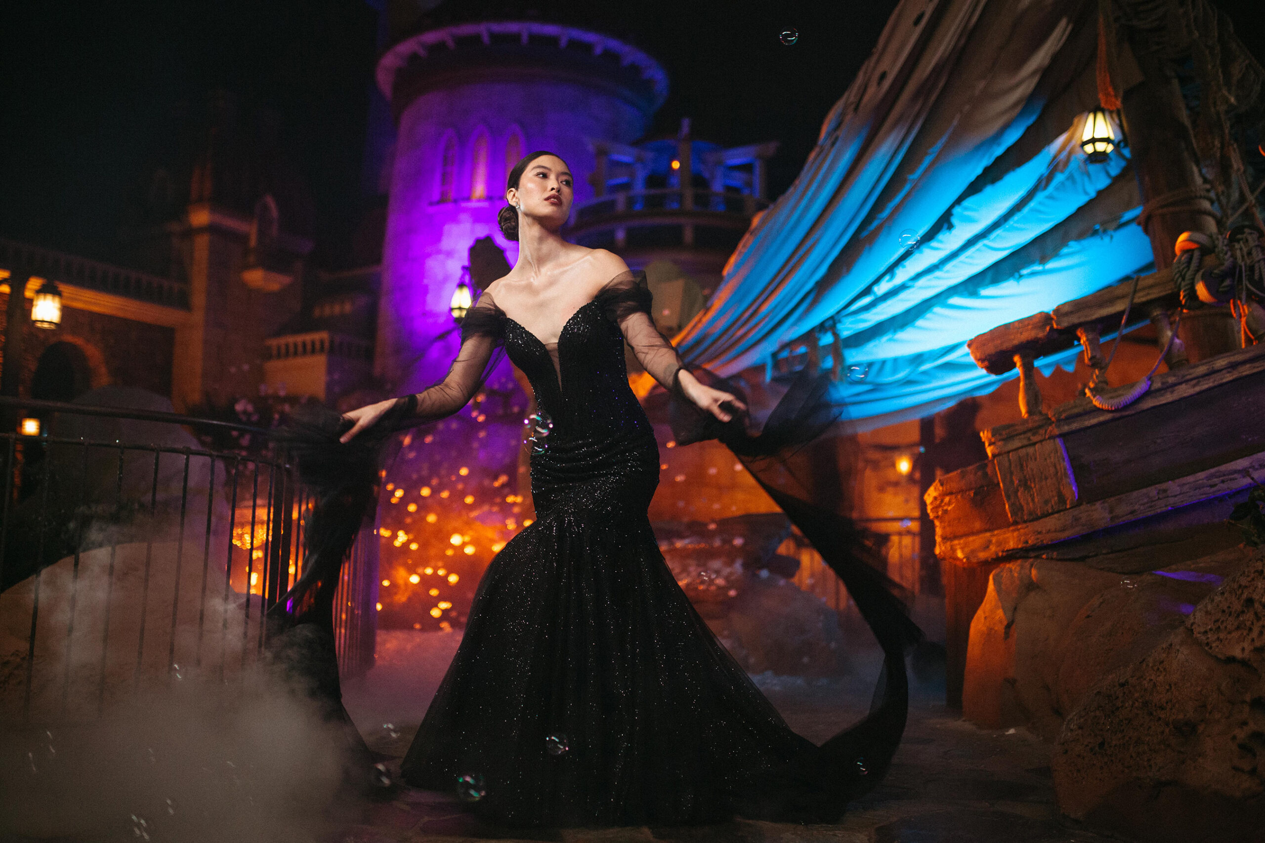 Ursula-Inspired Gown Channel the sea witch’s bold energy with a mermaid silhouette. Adorned with beaded tulle and sparkle accents, this gown is available in black or ivory. Detachable sheer sleeves with ruffled cuffs add a dramatic touch.