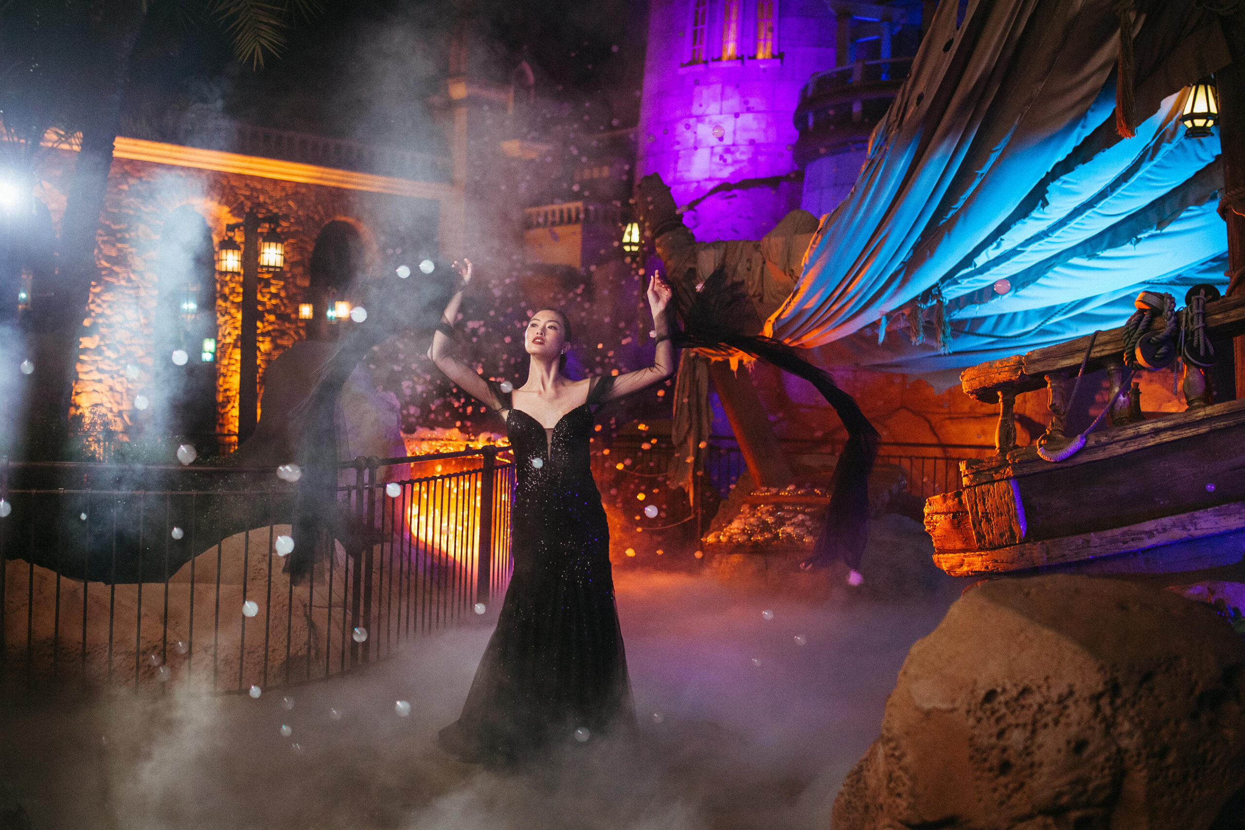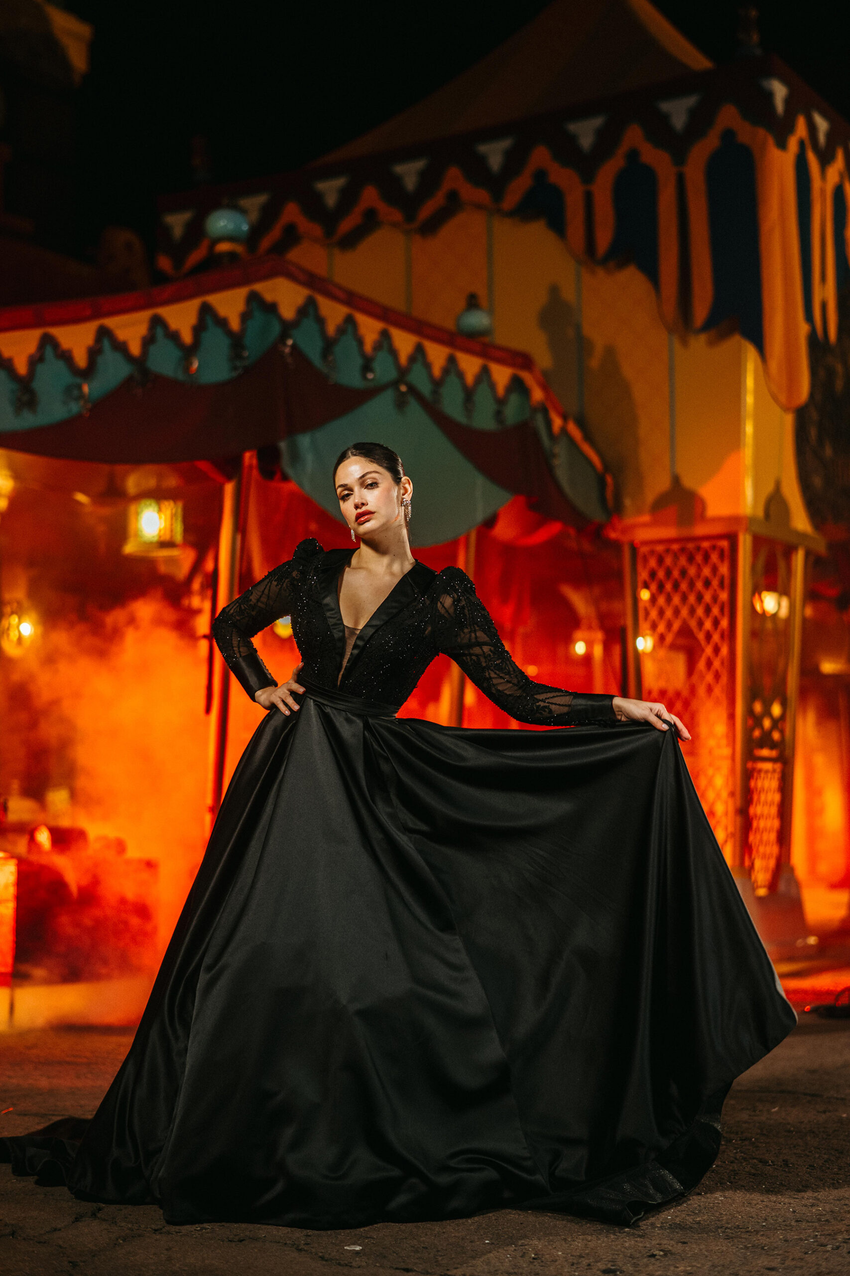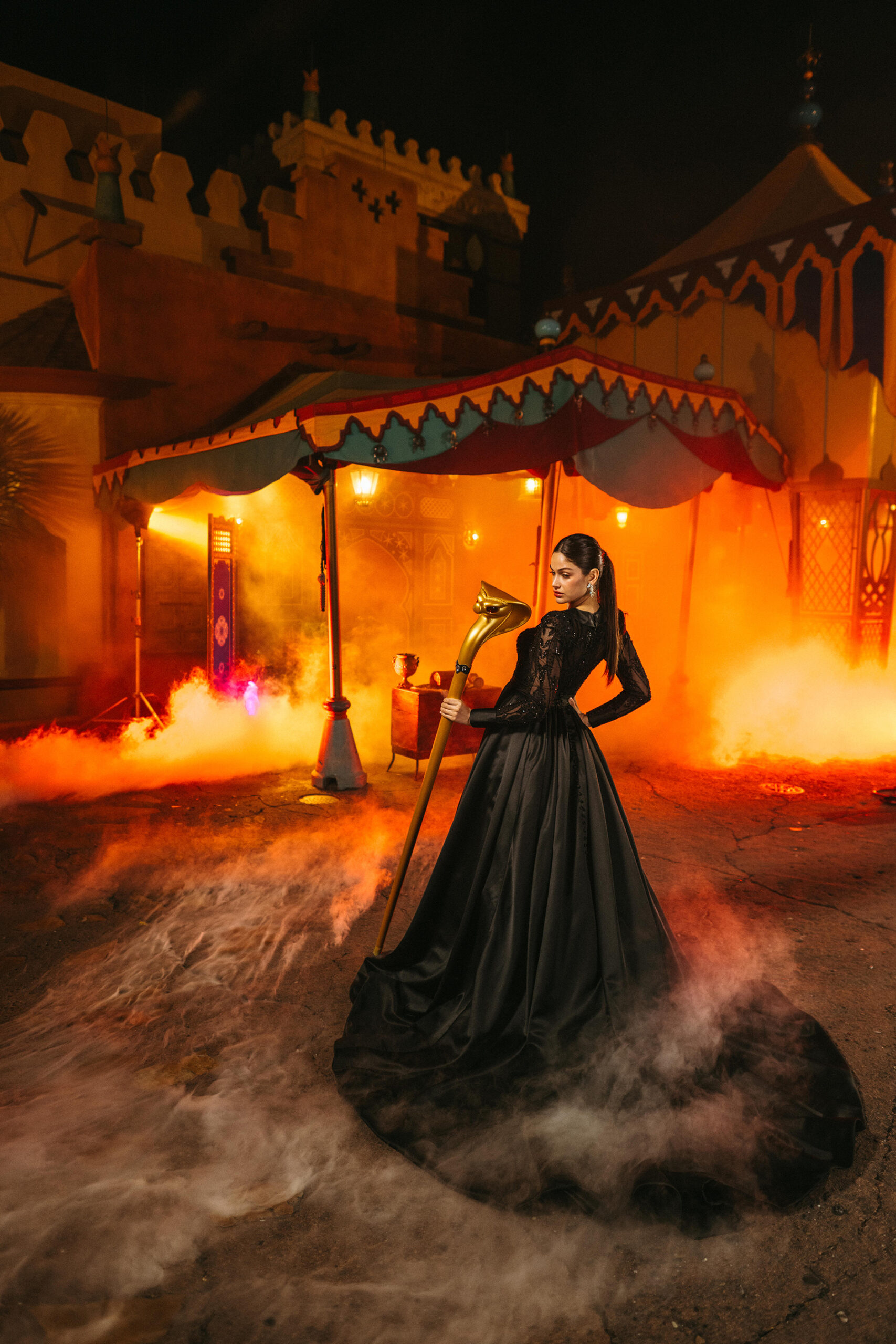 The new Disney’s Jafar wedding gown is shown in the setting of Agrabah Bazaar in Magic Kingdom Park at Walt Disney World in Lake Buena Vista, Fla. It is one of four new gowns inspired by Disney Villains and introduced as part of the 2024 Disney’s Fairy Tale Weddings collection from Allure Bridals. Inspired by the villain from Disney’s Aladdin, the gown offers a plunging neckline accentuated by a satin collar. It is available in ivory or black and features lightly puffed full-length sleeves with buttoned cuffs. (Claire Celeste, Photographer)