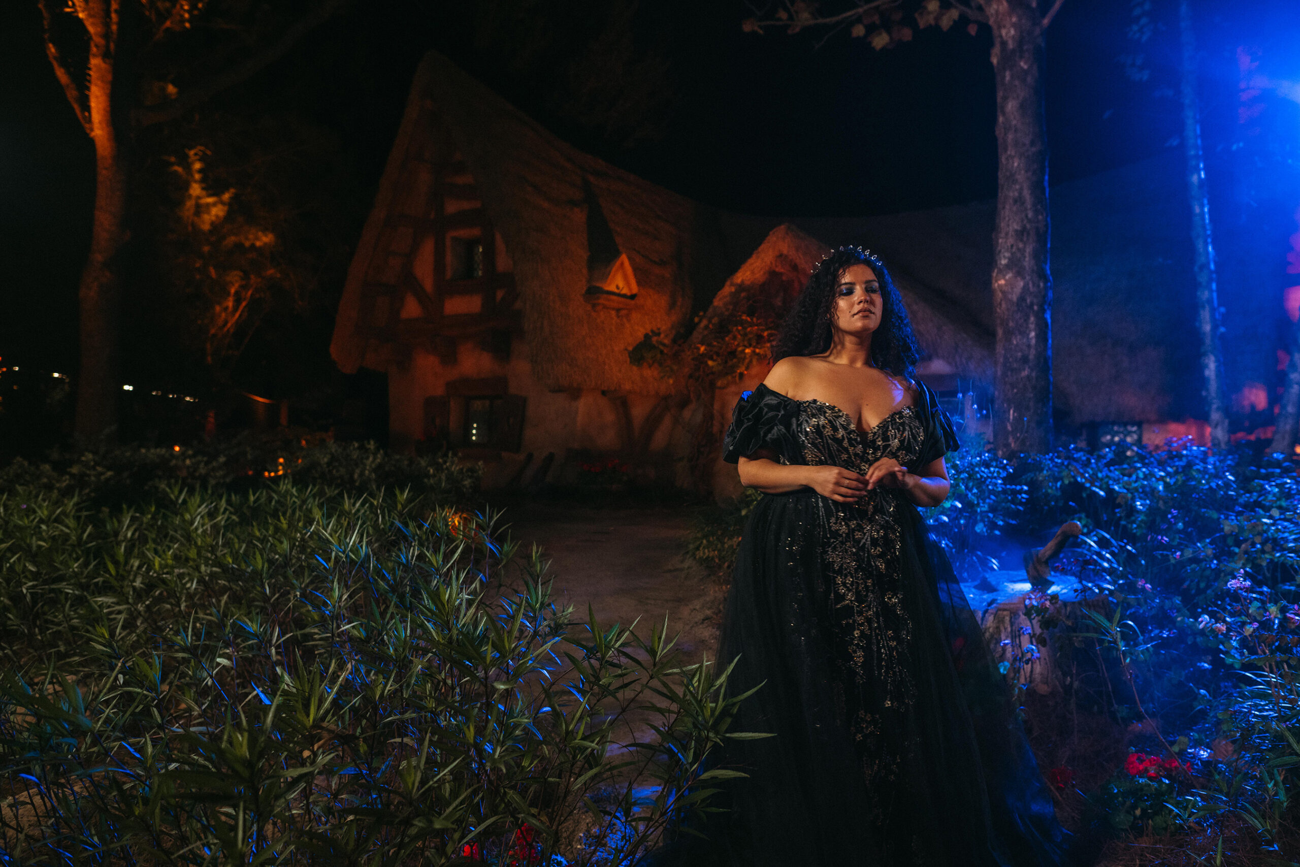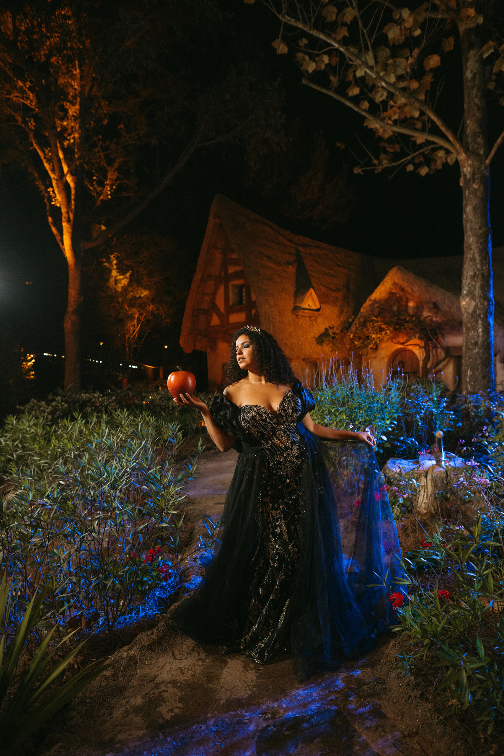 Evil Queen-Inspired Gown The Evil Queen gown dazzles with linear lace, 3D floral embellishments, and a peaked bodice. Available in black, ivory, or gold, it features a sweetheart neckline and a dramatic wrapped ruffle shawl.