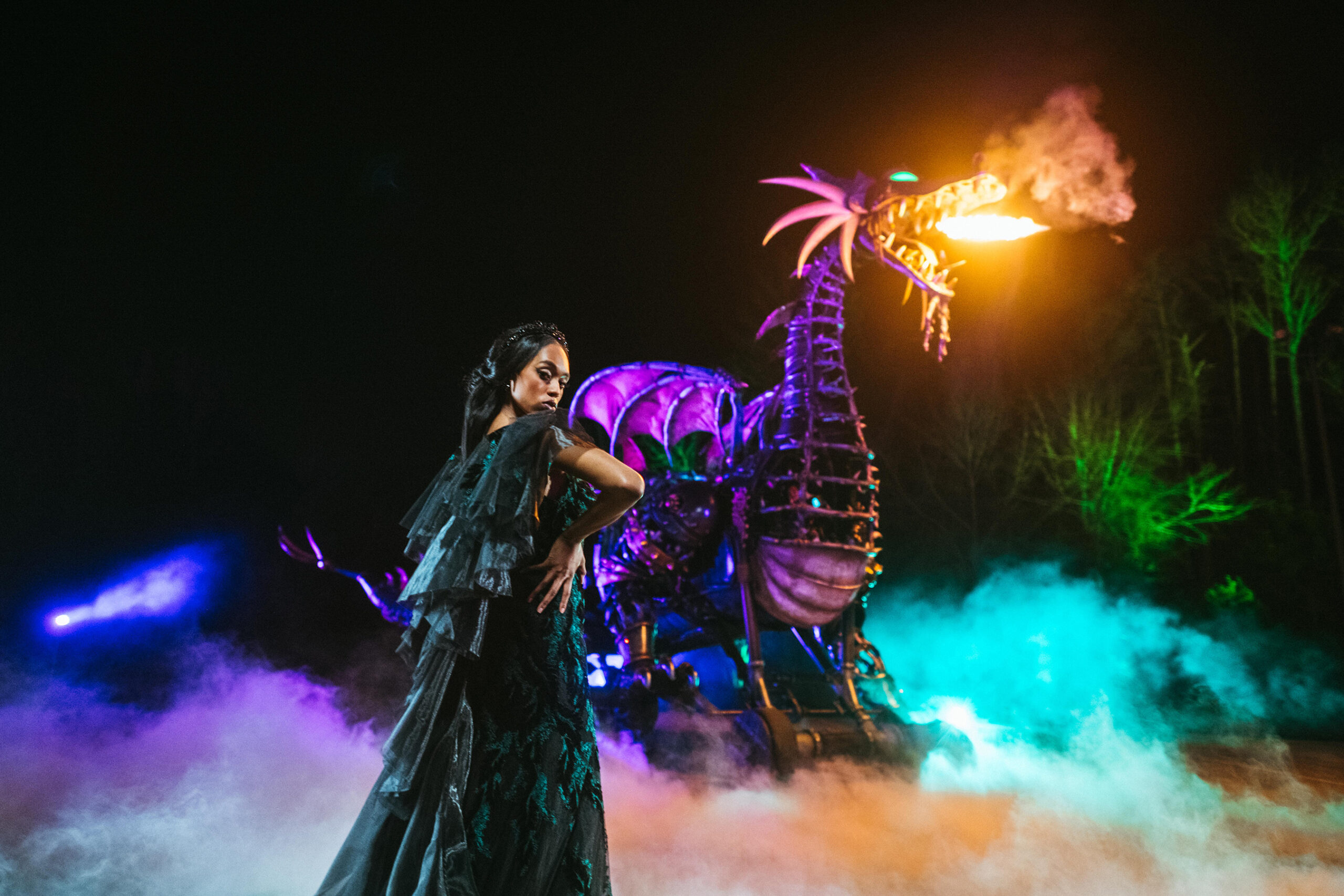 The new Disney’s Maleficent wedding gown is shown in Magic Kingdom Park at Walt Disney World Resort in Lake Buena Vista, Fla. It is one of four new gowns inspired by Disney Villains and introduced as part of the 2024 Disney’s Fairy Tale Weddings collection from Allure Bridals. Inspired by the villain from Disney’s “Sleeping Beauty,” the dress features shimmering green velvet embellishments and delicate lace appliques layered over black organza. The gown is also available in an ivory version, which offers chiffon lace accents for a softer touch. (Claire Celeste, Photographer)