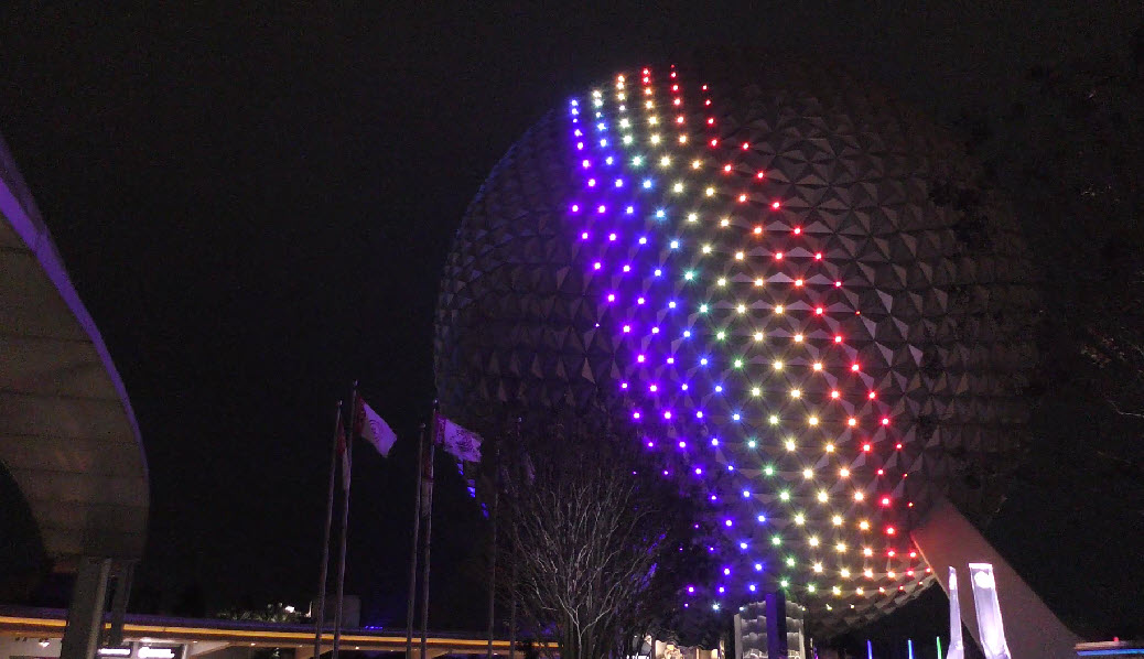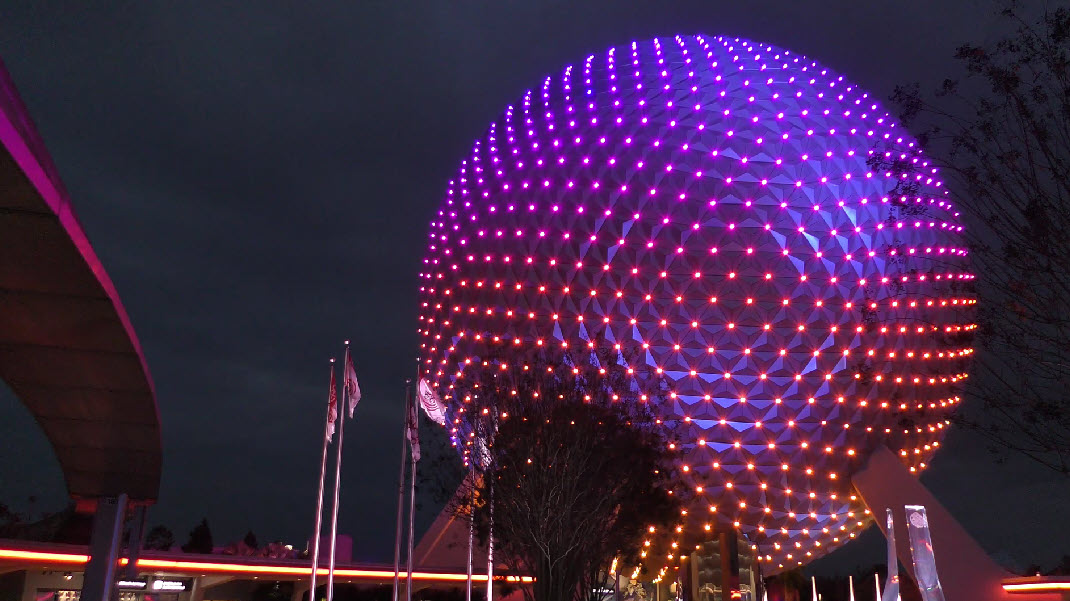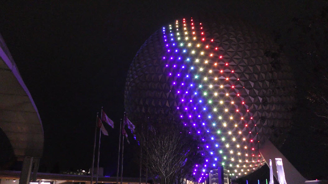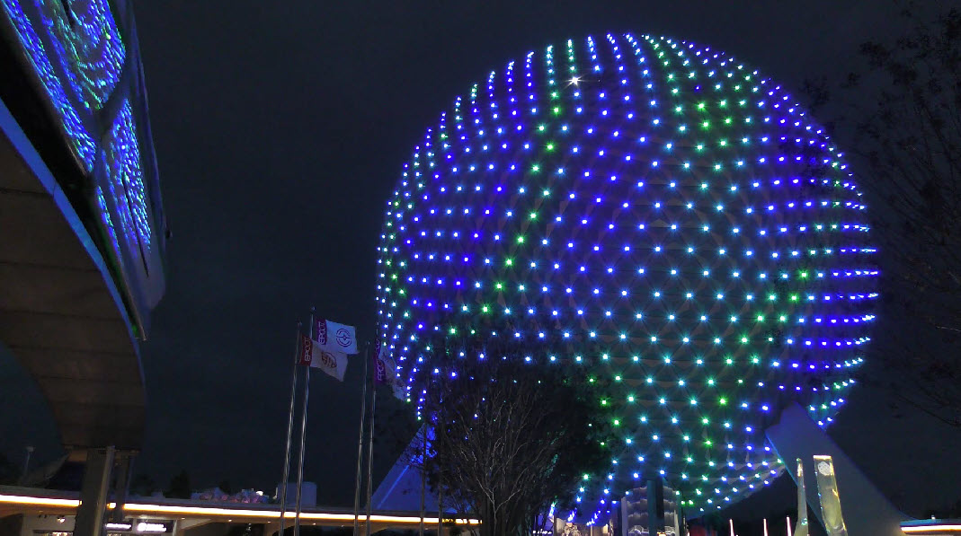 The Epcot Spaceship Earth lighting displays have become an iconic part of the park’s nighttime magic. Originally introduced for the 50th Anniversary Celebration, this stunning lighting effect has become a permanent feature. The experience has been elevated further with the opening of the World Celebration Garden, where the vibrant lighting extends beyond Spaceship Earth into the lush gardens.