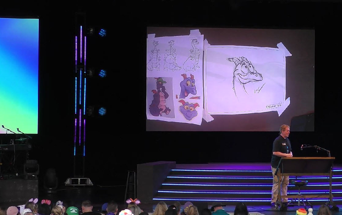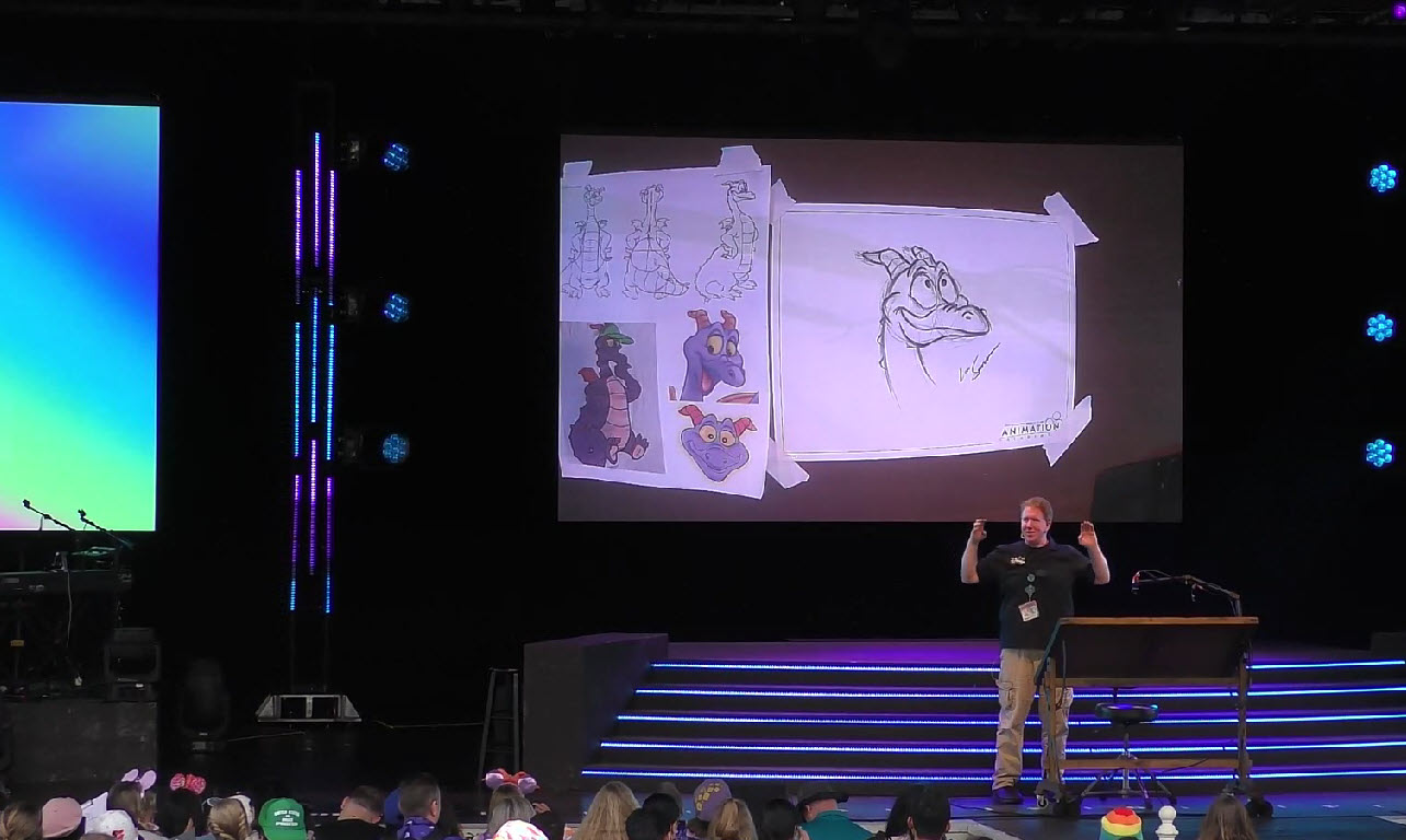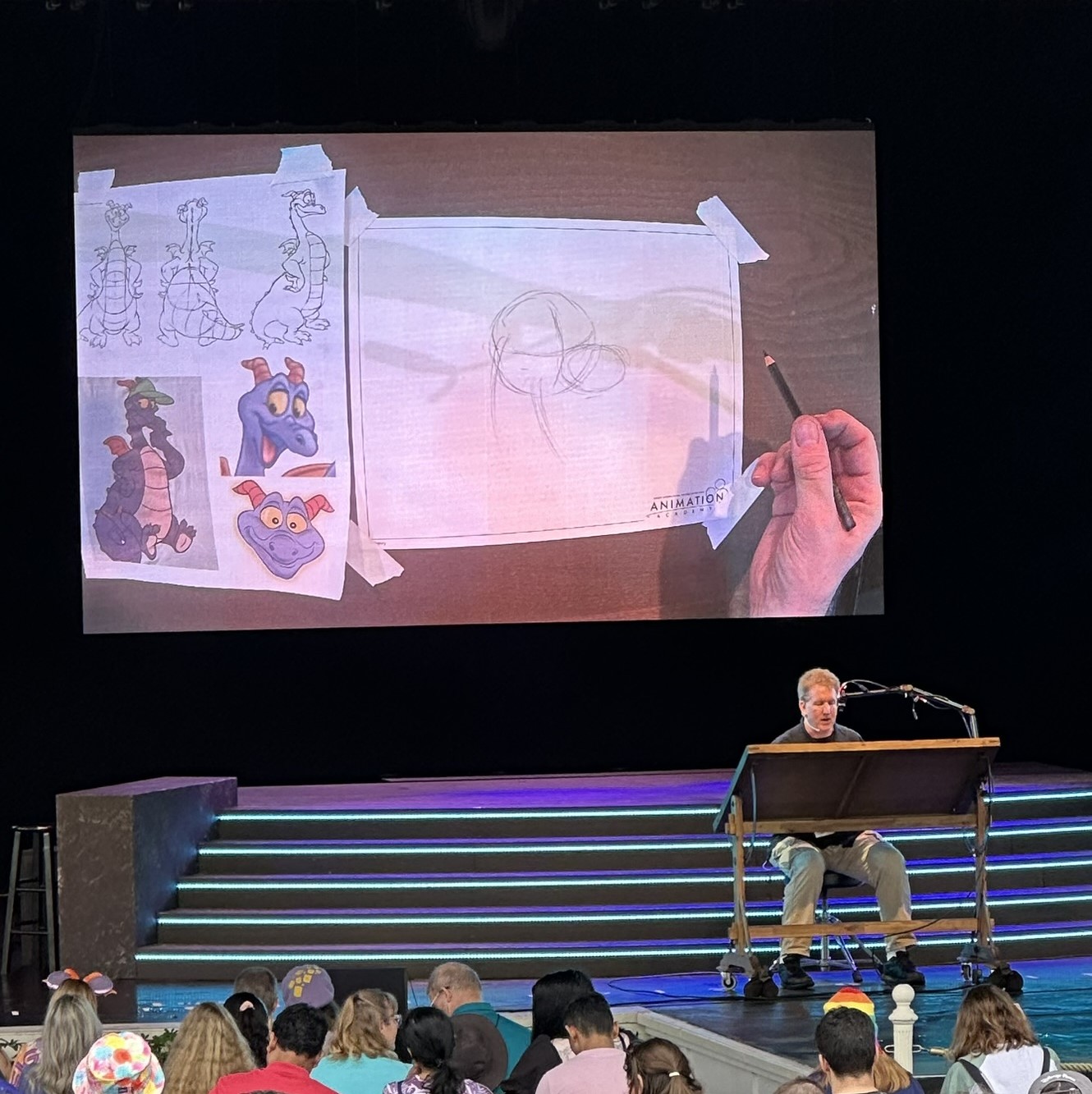 In our latest visit to Animation Academy, the featured character was none other than Figment! As part of this magical Disney animator sketch session, we watched Figment come to life on the page. The crowd joined in, pencils in hand, for a uniquely memorable moment.